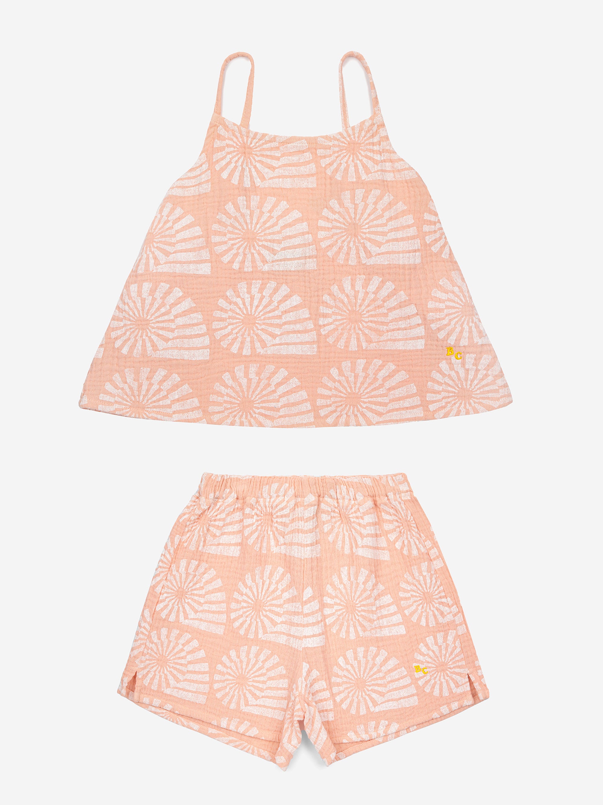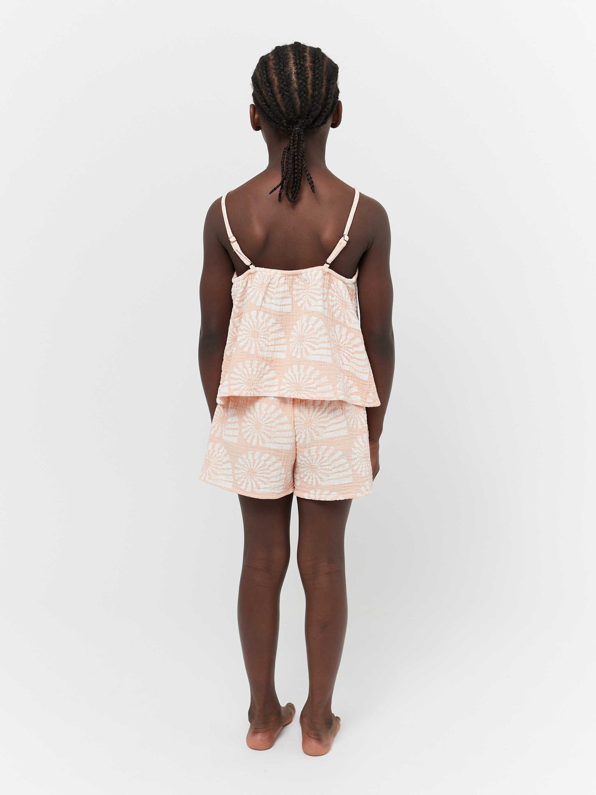 100% organic cotton light pink pijama. Designed with adjustable straps, elasticated waistband, embroidery and short. It has a relaxed fit. Made in Spain
