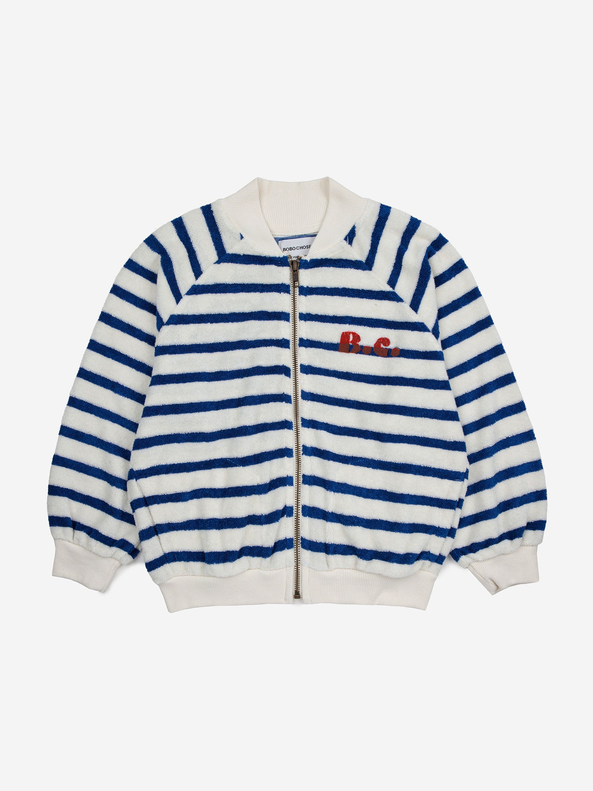 58% organic cotton 30% cotton 12% polyester white zipped sweatshirt. Designed with flat collar, long sleeves, front zip fastening, ribbed cuffs and ribbed bottom. It has a loose fit. Made in Spain