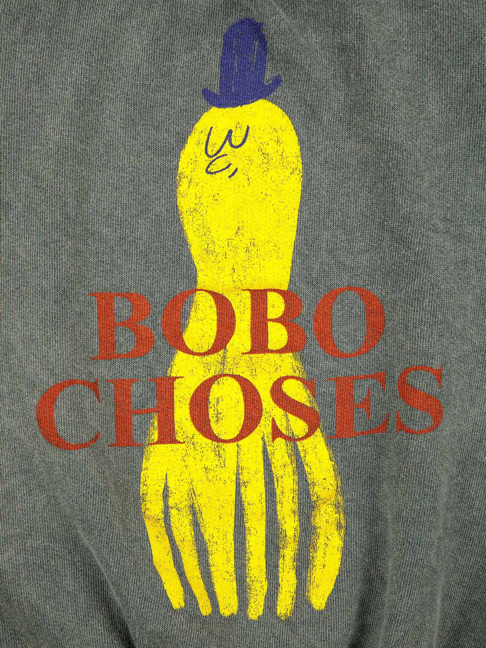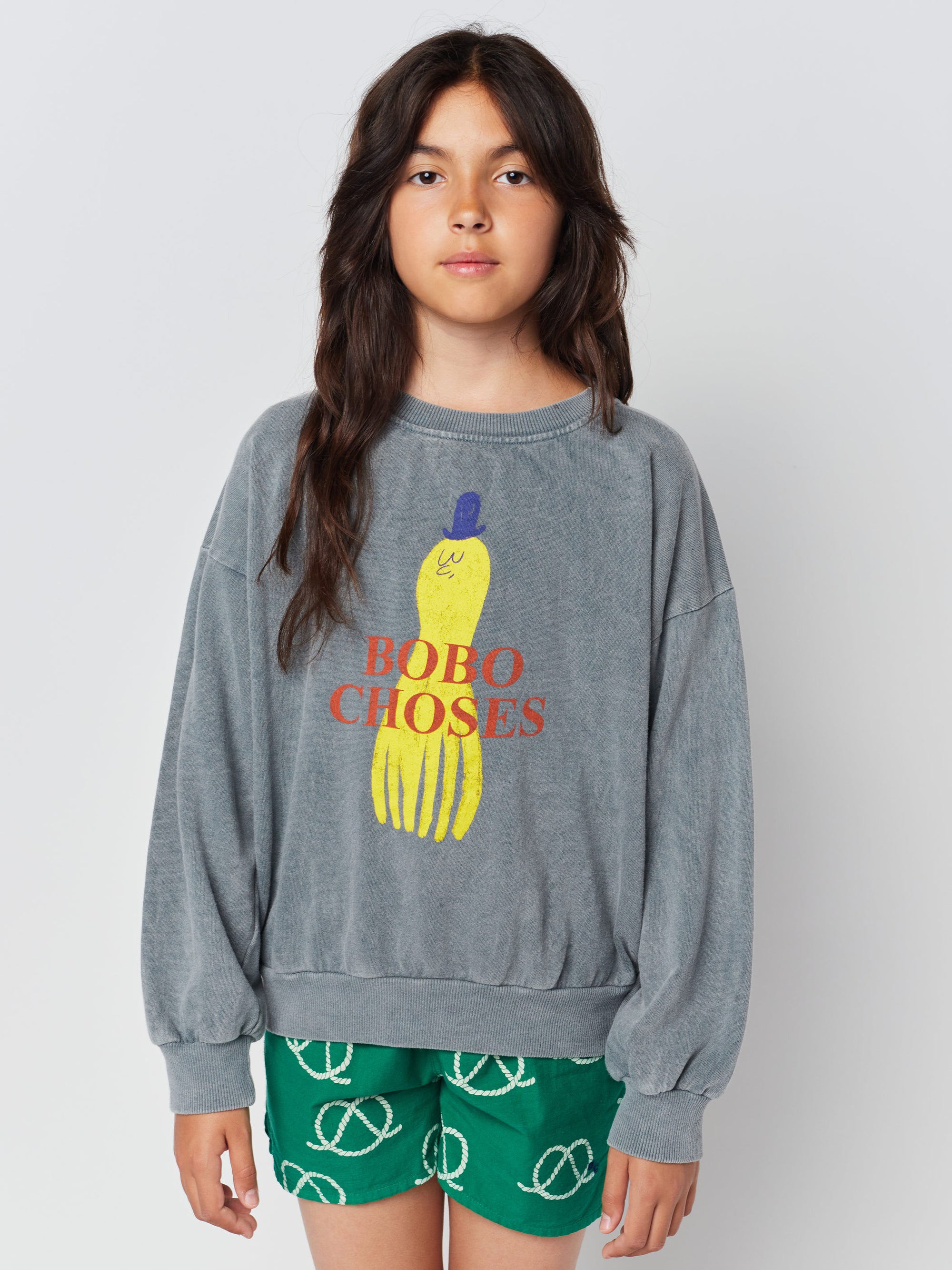 100% organic cotton grey round neck sweatshirt. Designed with long sleeves, ribbed cuffs, ribbed bottom, round neck and fleece. It has a loose fit. Made in Spain