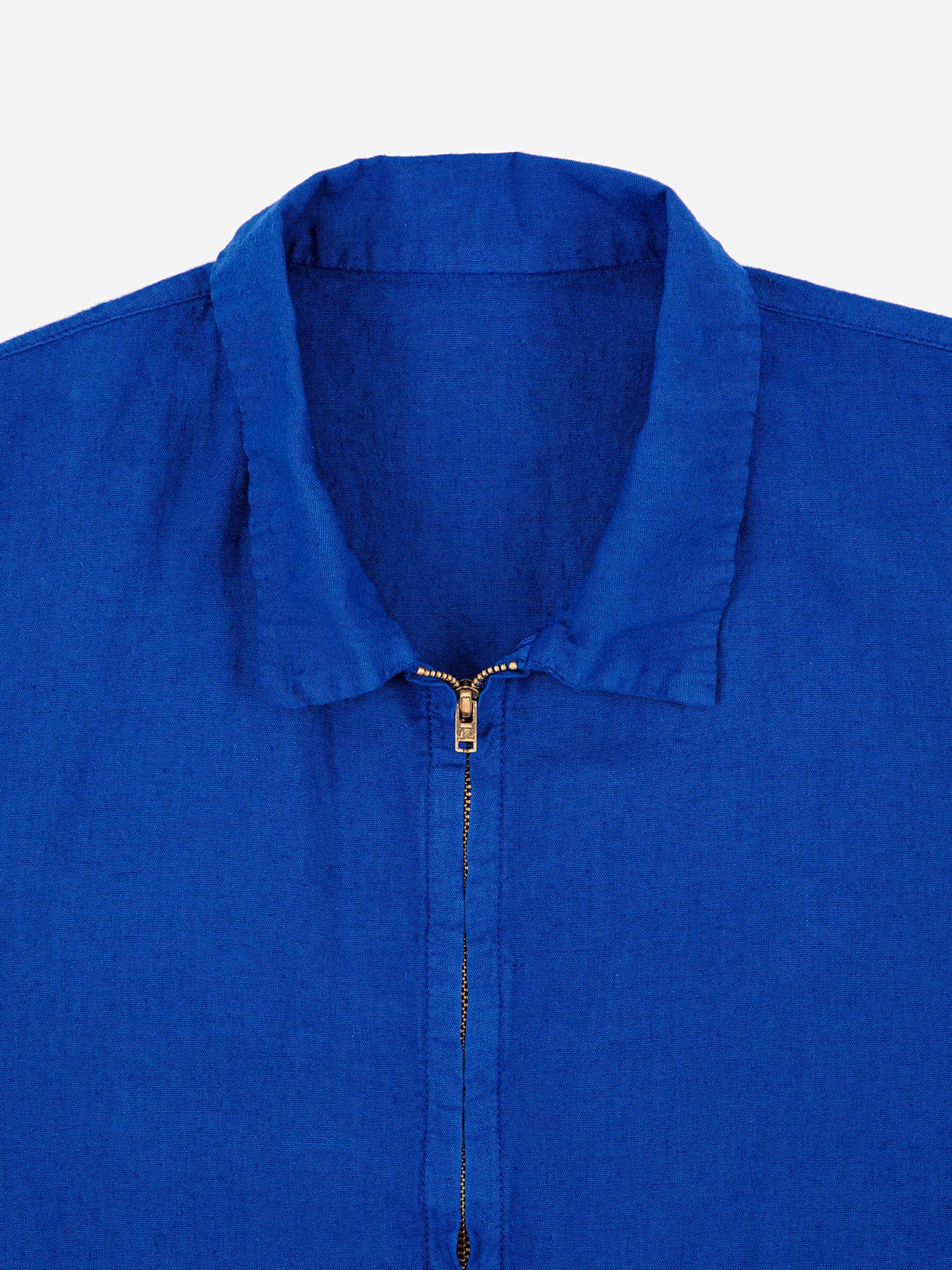 50% cotton 50% linen blue short sleeve overall. Designed with tailored collar, regular crotch, zipped, embroidery, regular, long length and linen blend. It has a relaxed fit. Made in Spain