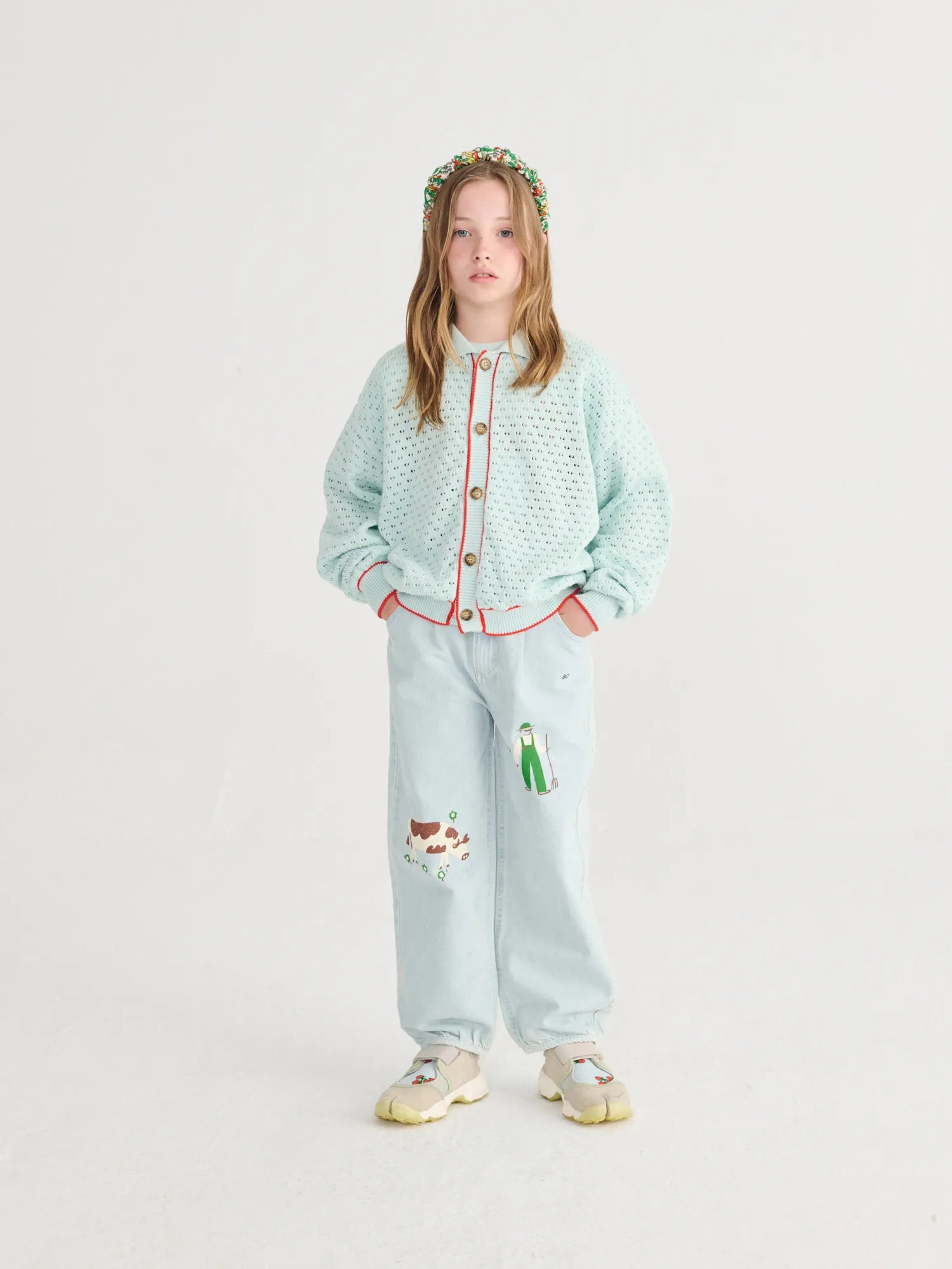 Cárdigan de color azul claro. Diseño de cuello plano, manga larga con hombros caídos, cierre de botones delantero, puños y dobladillo en canalé, bordado, confección en punto calado, corte holgado y cuello redondo. Producto fabricado en España.