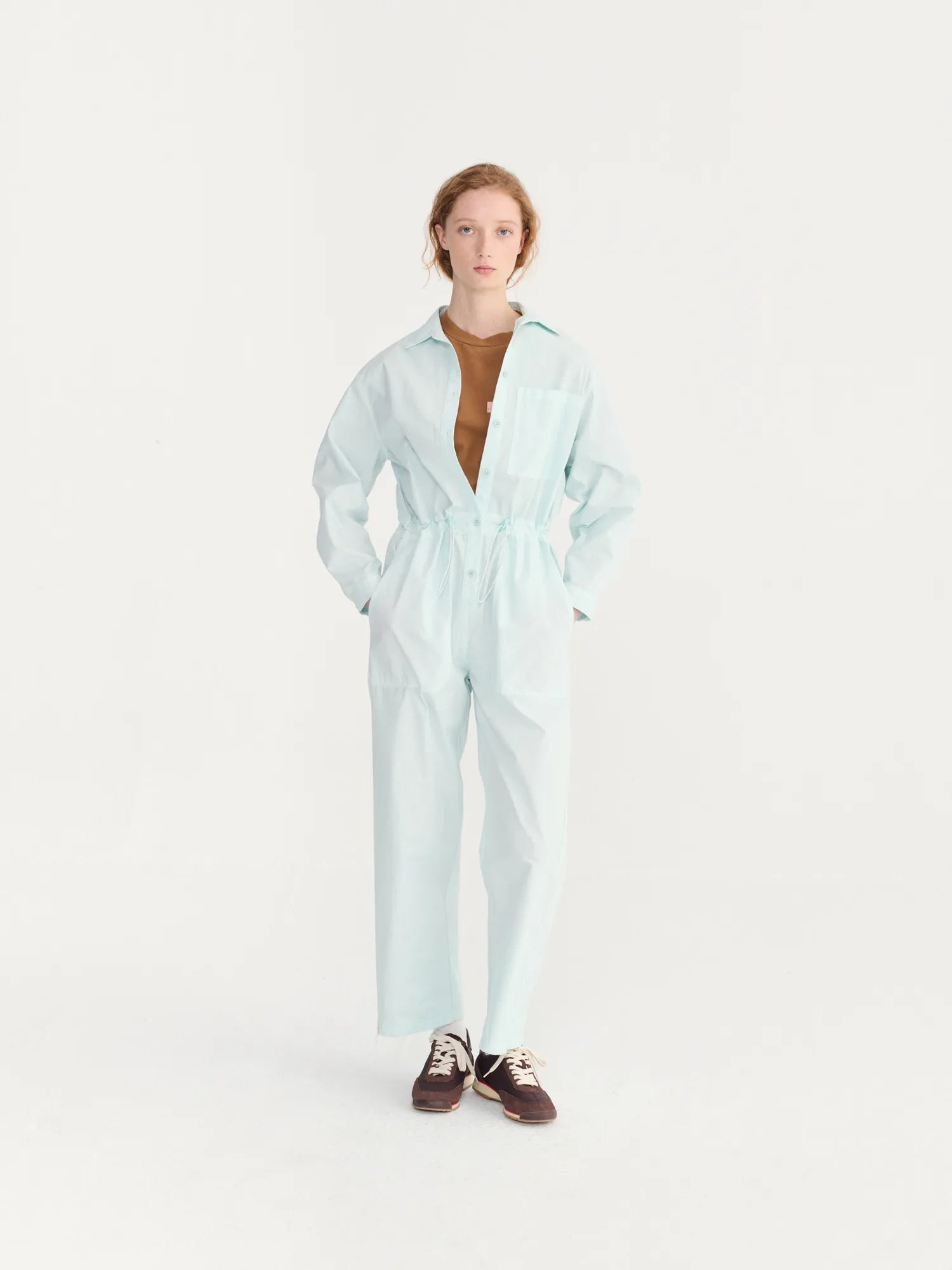 Mono de color azul claro. Diseño de corte relajado con perneras rectas, con bolsillos y confección en tejido ligero no elástico. Tallaje normal, elige la talla habitual. Producto fabricado en España.
