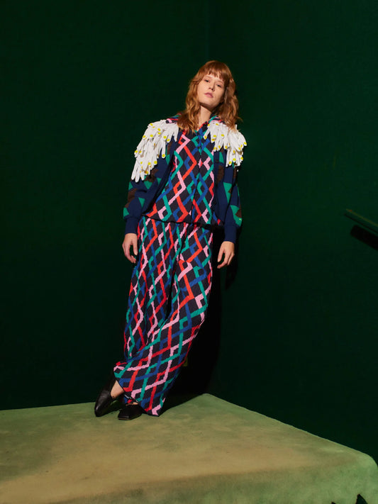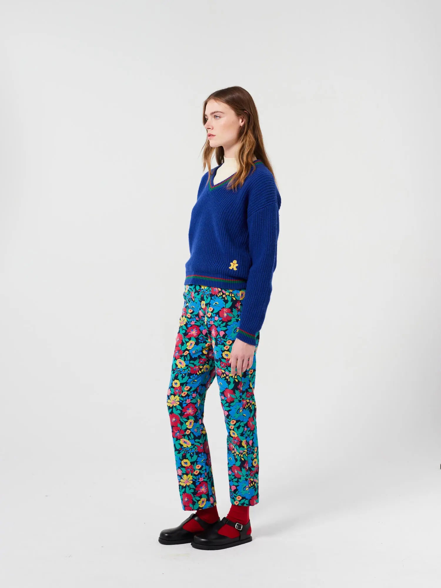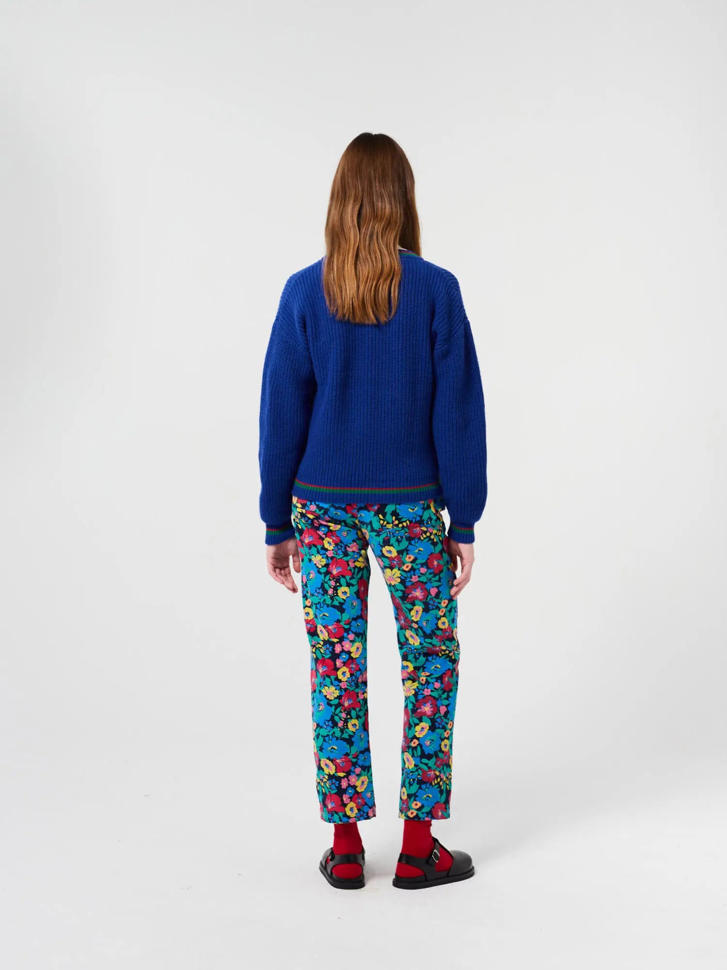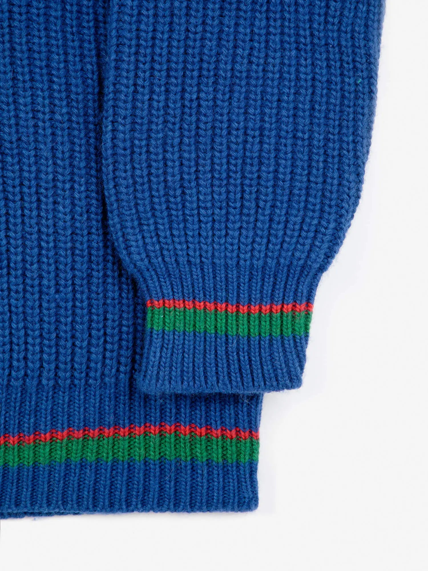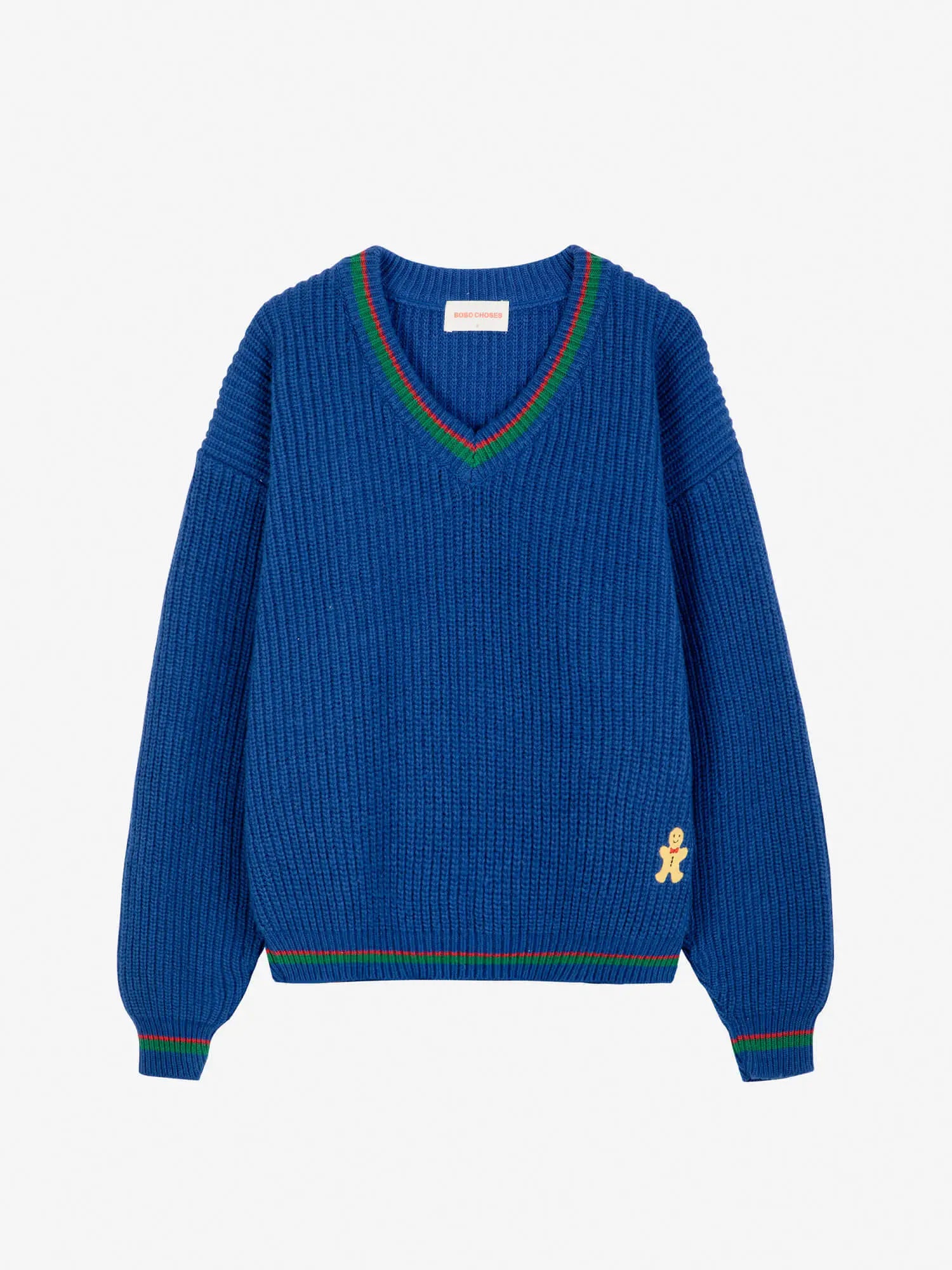 El jersey azul marino está decorado con el divertido motivo de un hombrecillo de pan de jengibre en el pecho, con detalles de rayas en rojo, verde oliva y crudo en el cuello, los puños y el dobladillo. Está confeccionado con una mezcla de diferentes fibras para brindar calidez y más flexibilidad. Su diseño es muy favorecedor para cualquier silueta, sin limitar la movilidad lo más mínimo.