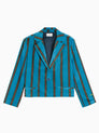 Chaqueta blazer de color azul marino confeccionada con un 98 % de algodón BCI y un 2 % de elastano. Diseño de corte relajado, largo cropped, con tejido no elástico de densidad media. Tallaje normal, elige la talla habitual. Producto fabricado en España.