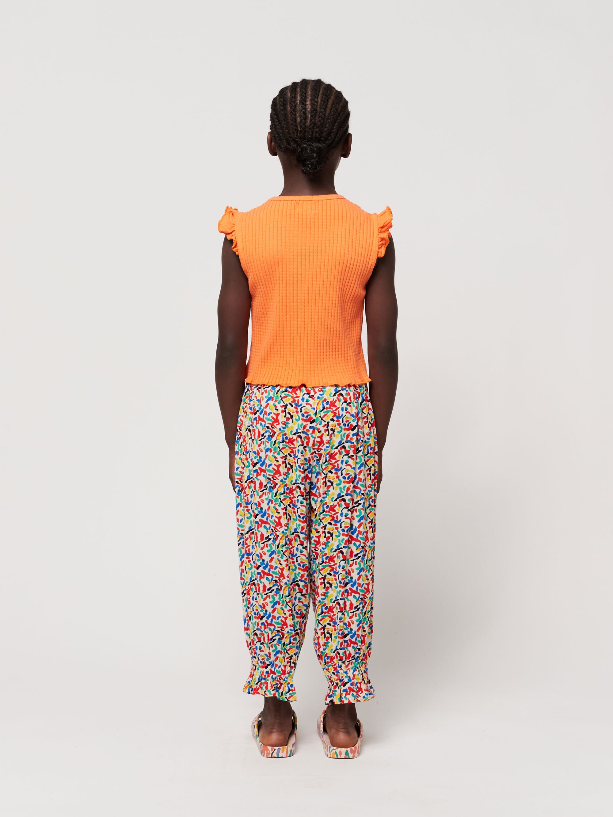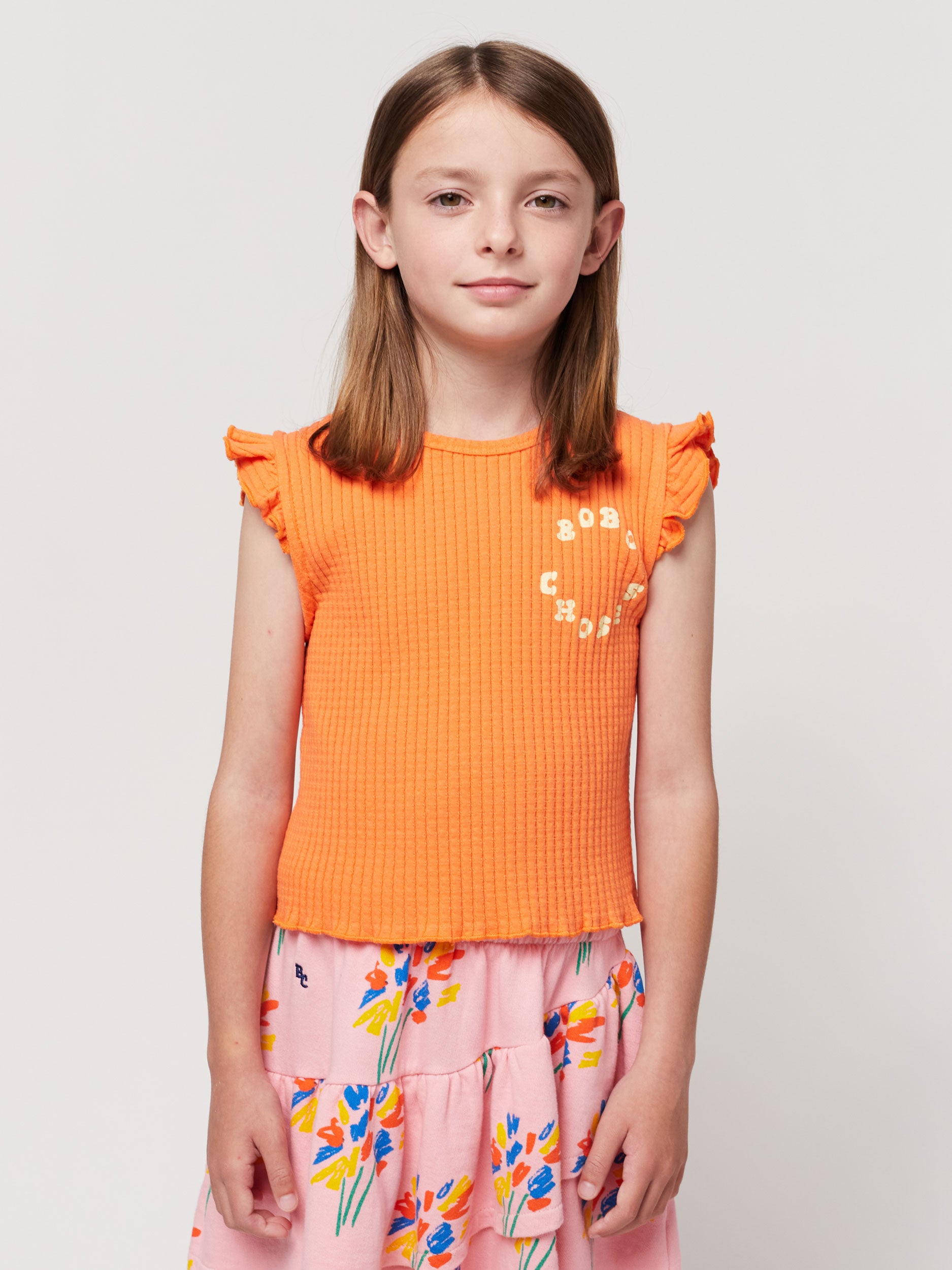 T-shirt orange 96% coton biologique, 4% élasthanne. Conçu avec une coupe slim sans manches, un col rond, un tissu structuré et des détails volants. Fabriqué en Espagne.