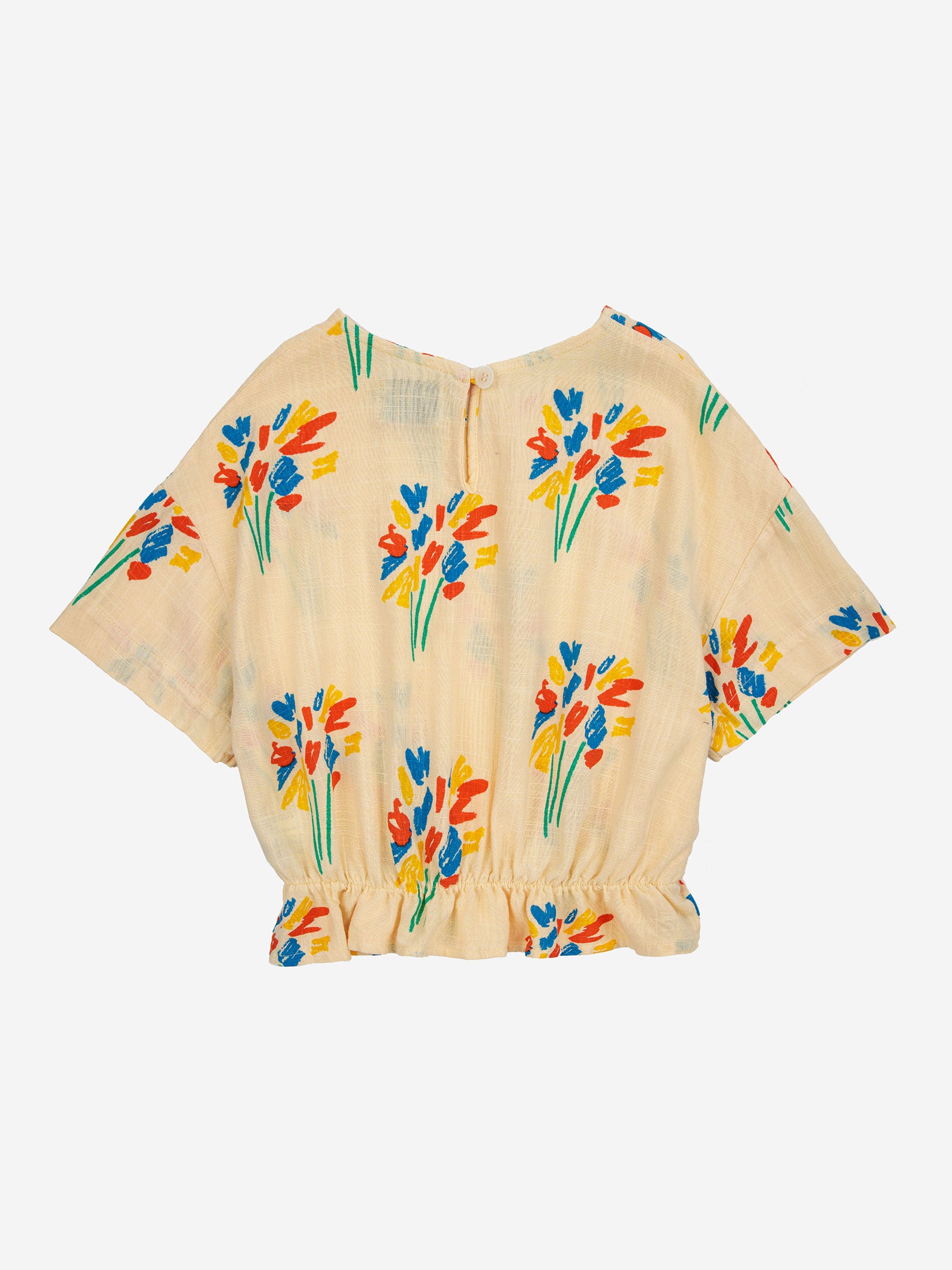 Chemise jaune clair 85% viscose, 15% lin. Conçu avec des manches courtes, une fermeture boutonnée au dos, un bas élastiqué, une broderie, une coupe ample, un col rond, un mélange de lin et un revers. Fabriqué en Espagne.