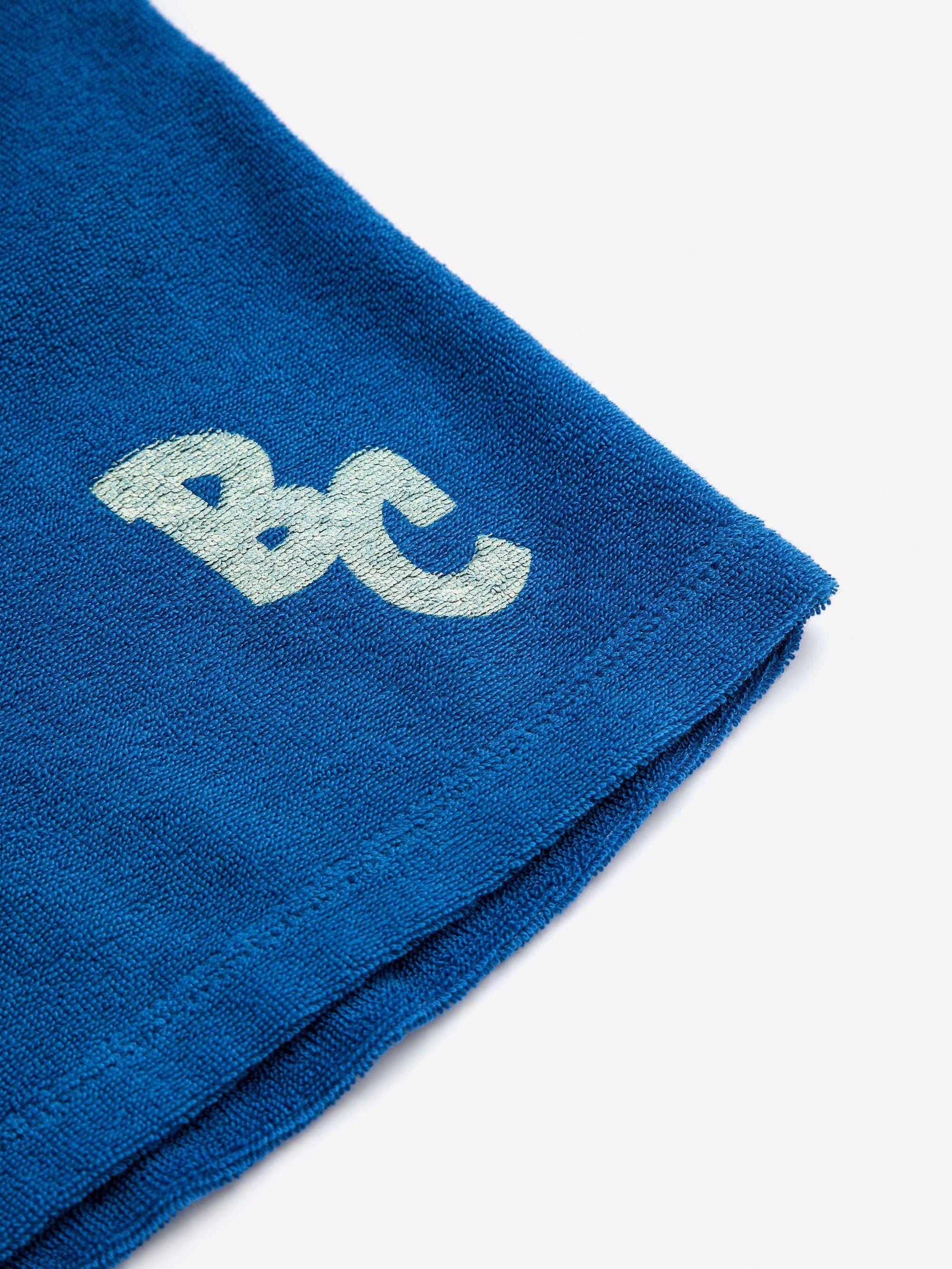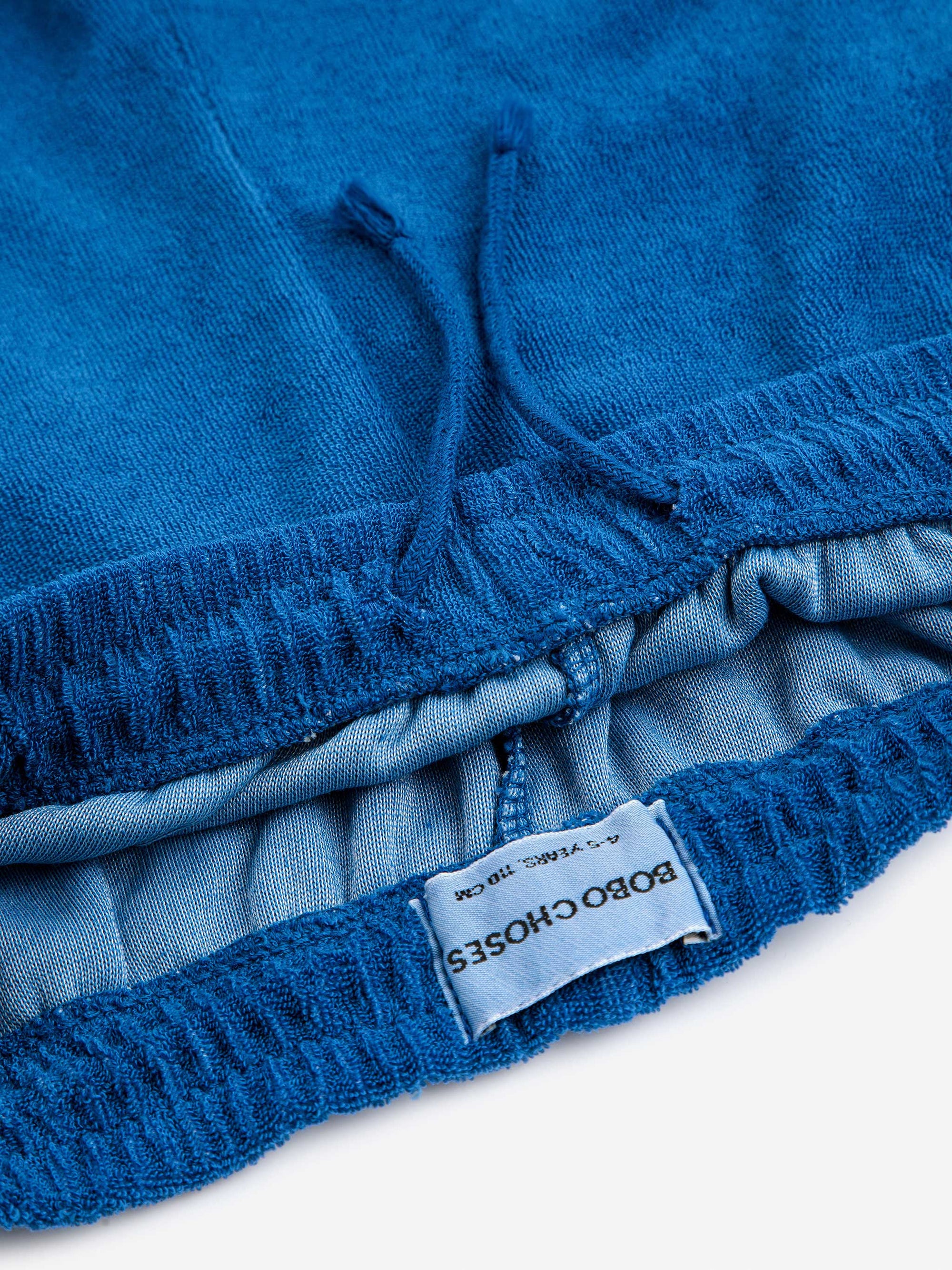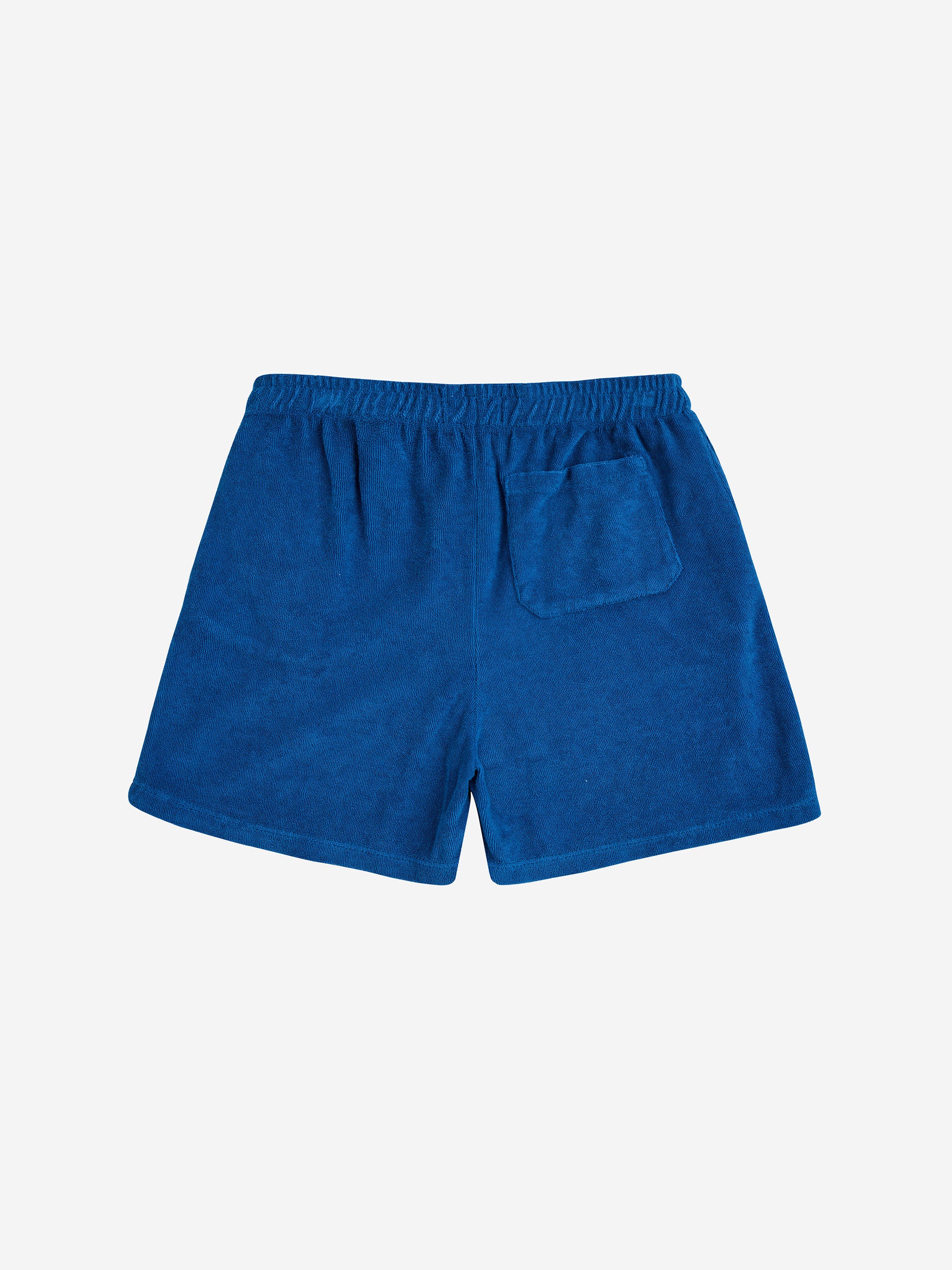 Short bleu 85% coton, 15% polyester. Conçu avec un entrejambe régulier, une taille élastiquée, une coupe ample, un cordon de serrage régulier et réglable, une longueur au-dessus du genou et une poche dans la couture. Fabriqué en Espagne.