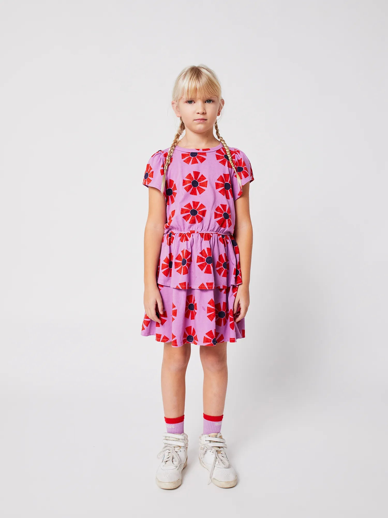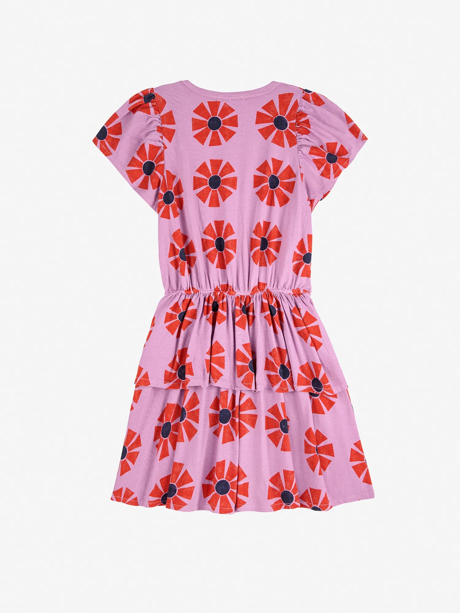 Robe violette. Ce vêtement long jusqu'au-dessus du genou est doté de manches courtes, d'une taille élastique, d'une coupe évasée et d'un col rond. Fabriqué en Espagne.
