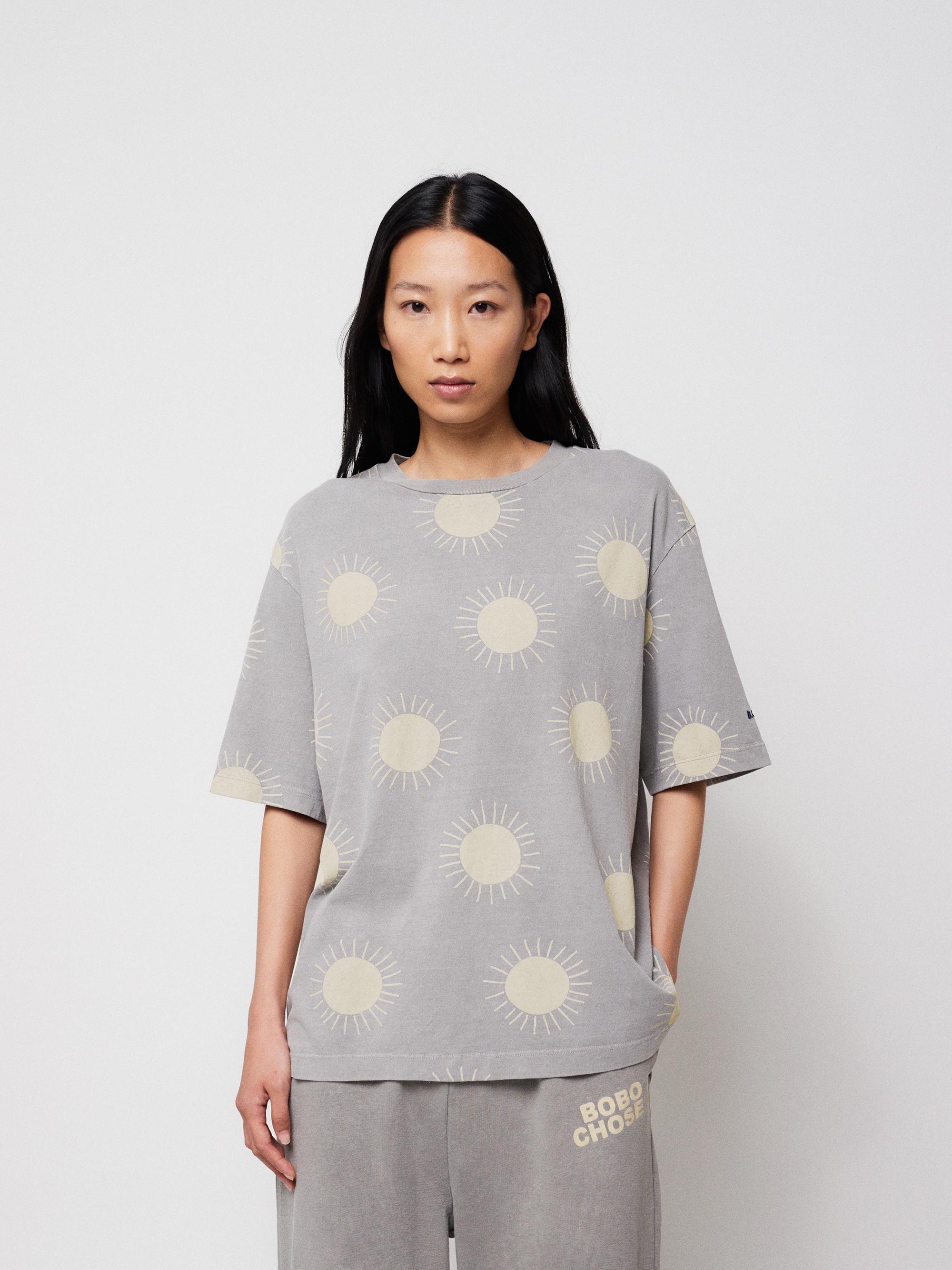 Le t-shirt gris à manches courtes « Sun », confectionné en coton recyclé, présente un imprimé all-over de soleil en blanc cassé. Sa coupe décontractée et son tissu extensible offrent confort et liberté de mouvement, ce qui le rend idéal pour le superposer ou le porter seul. Cette pièce polyvalente et intemporelle s'associe facilement avec d'autres vêtements.