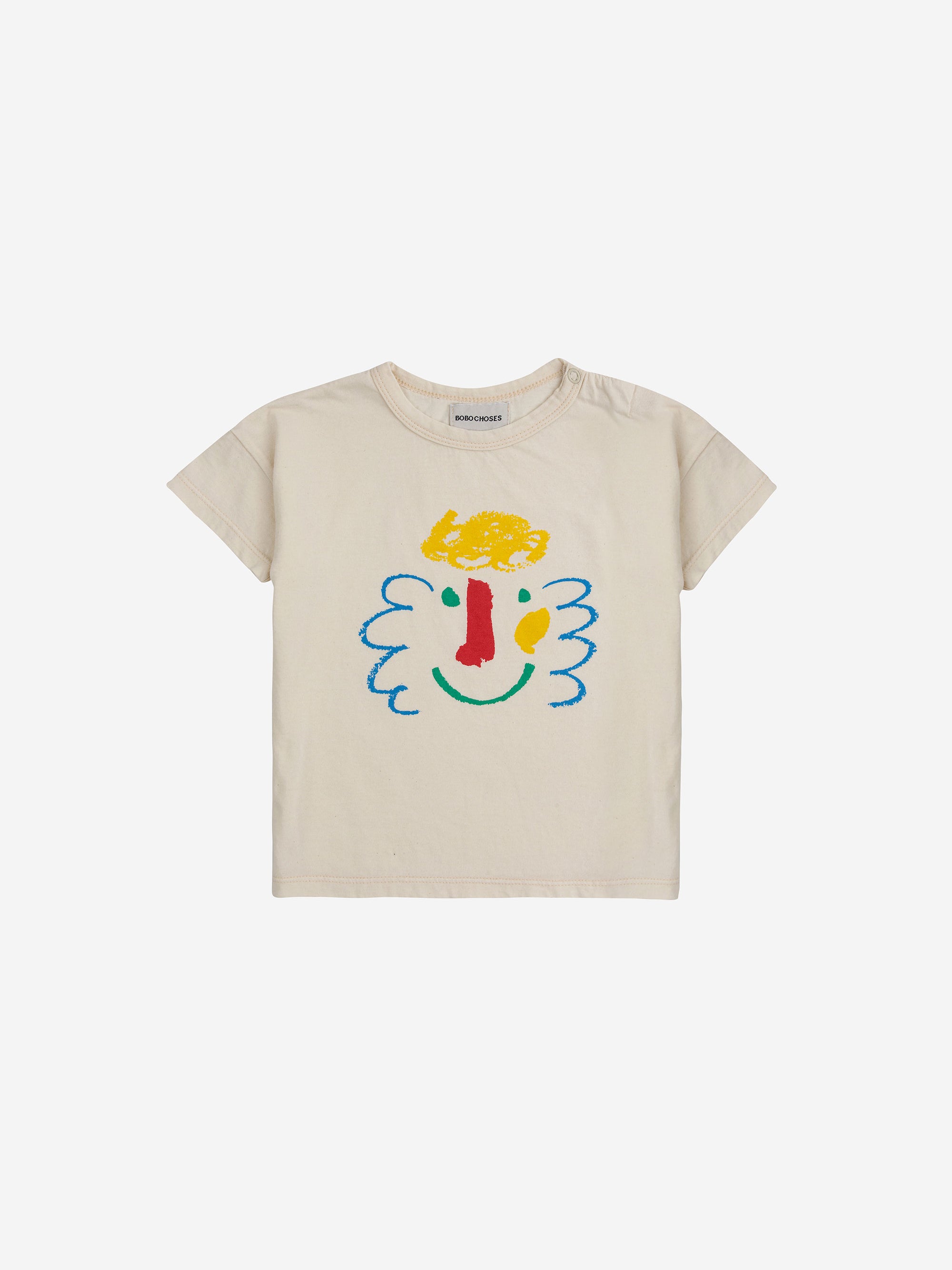 오가닉 코튼 100%로 제작된 오프화이트 색상의 티셔츠입니다. 반소매, 드롭 숄더, 어깨 스냅 버튼으로 여미는 방식, 루즈 핏으로 구성된 디자인입니다. 스페인에서 제작됨.