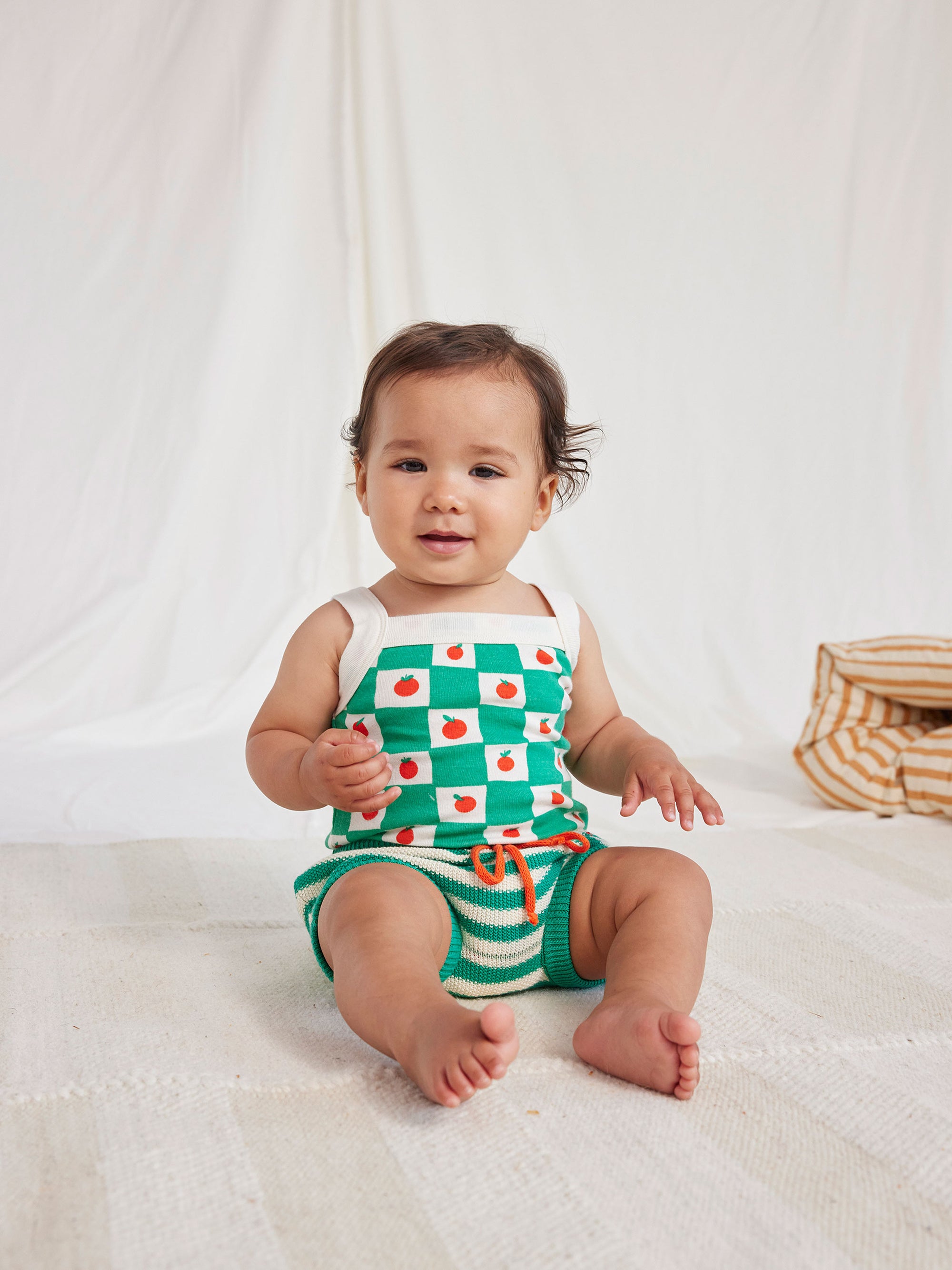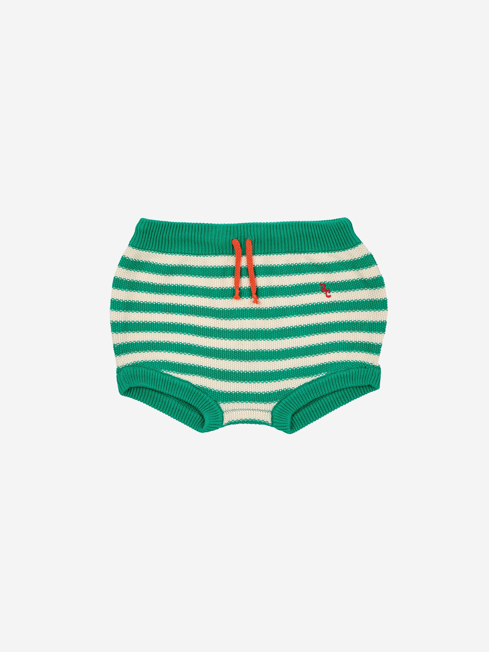 오가닉 코튼 100%로 제작된 그린 색상의 쇼츠입니다. 골지 커프스, 골지 웨이스트밴드, 자수, 텍스처 니트, 배기 핏, 조절 가능한 드로우스트링으로 구성된 디자인입니다. 스페인에서 제작됨.