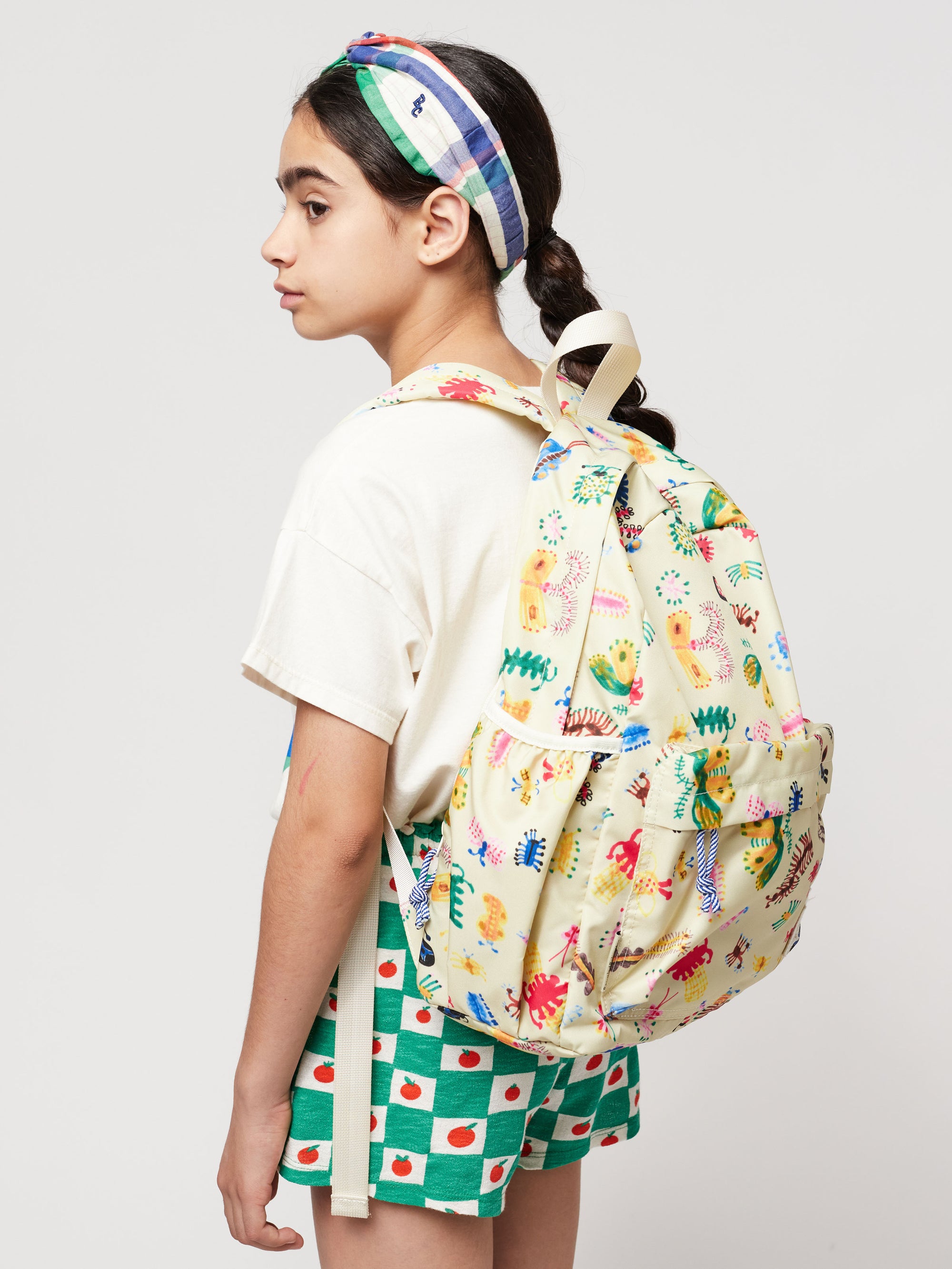 재생 폴리에스터 100%로 제작된 오프화이트 색상의 백팩입니다. 중국에서 제작됨.