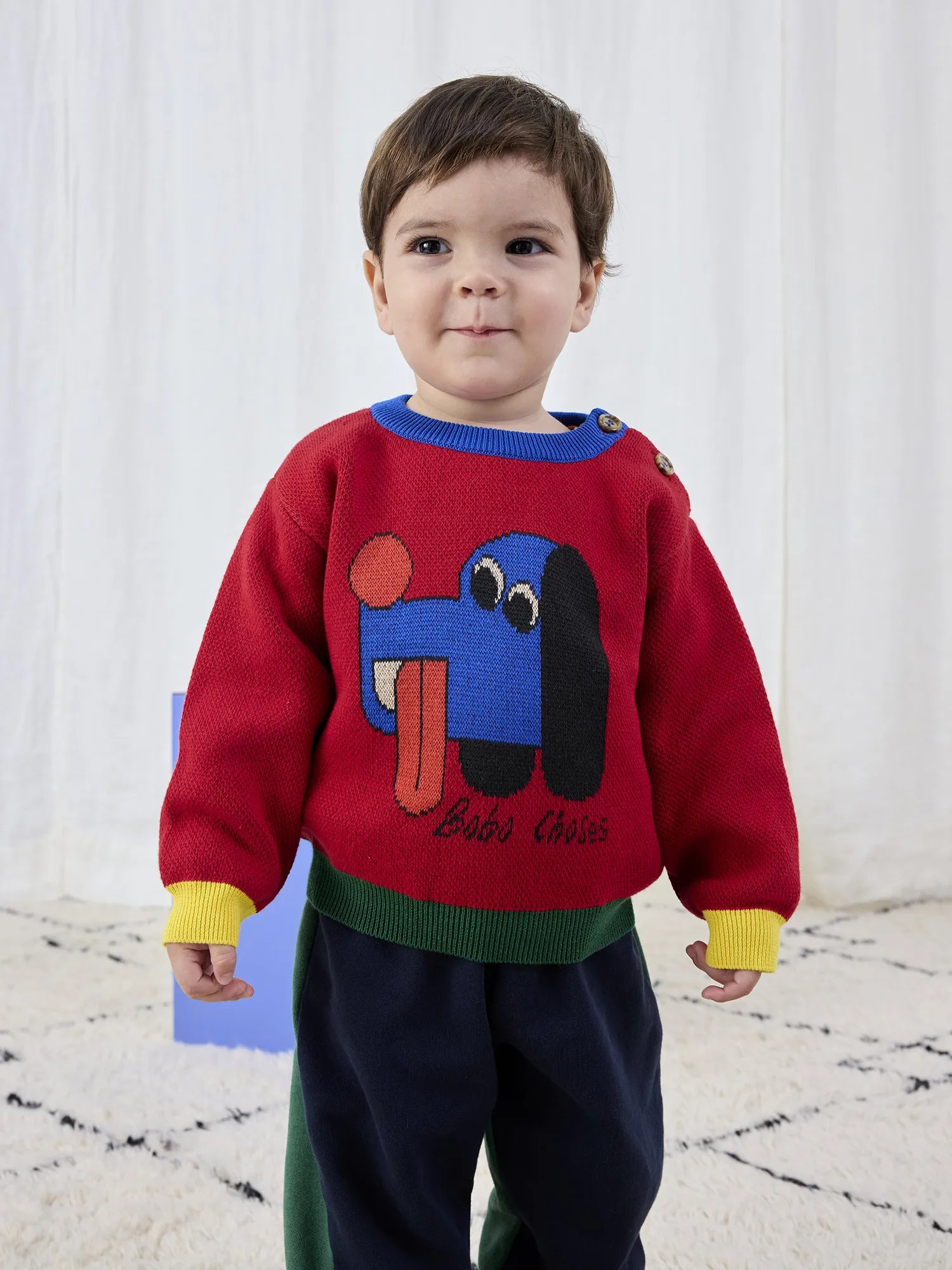 빨간색 점퍼입니다. 크루 넥, 긴소매, 드롭 숄더, 어깨 버튼 여밈, 리브드 마감 소맷단, 자카드 직, 루즈 핏, 리브드 마감 밑단으로 디자인 되었습니다. 제조국 스페인.