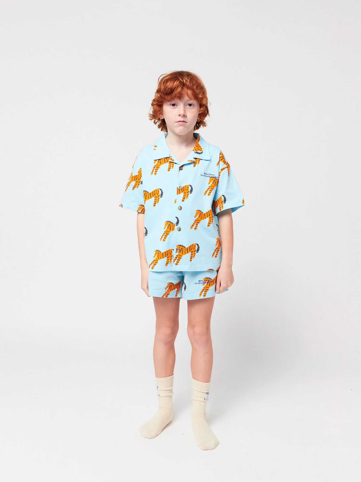 언제나 인기 있고 편안한 디자인! 유기농 면 100%로 제작되었으며, 자수 놓인 반소매 버튼 업 셔츠와 허리 밴드가 늘어나는 여유로운 반바지로 구성된 하늘색 실내복 세트입니다. 제조국 중국.