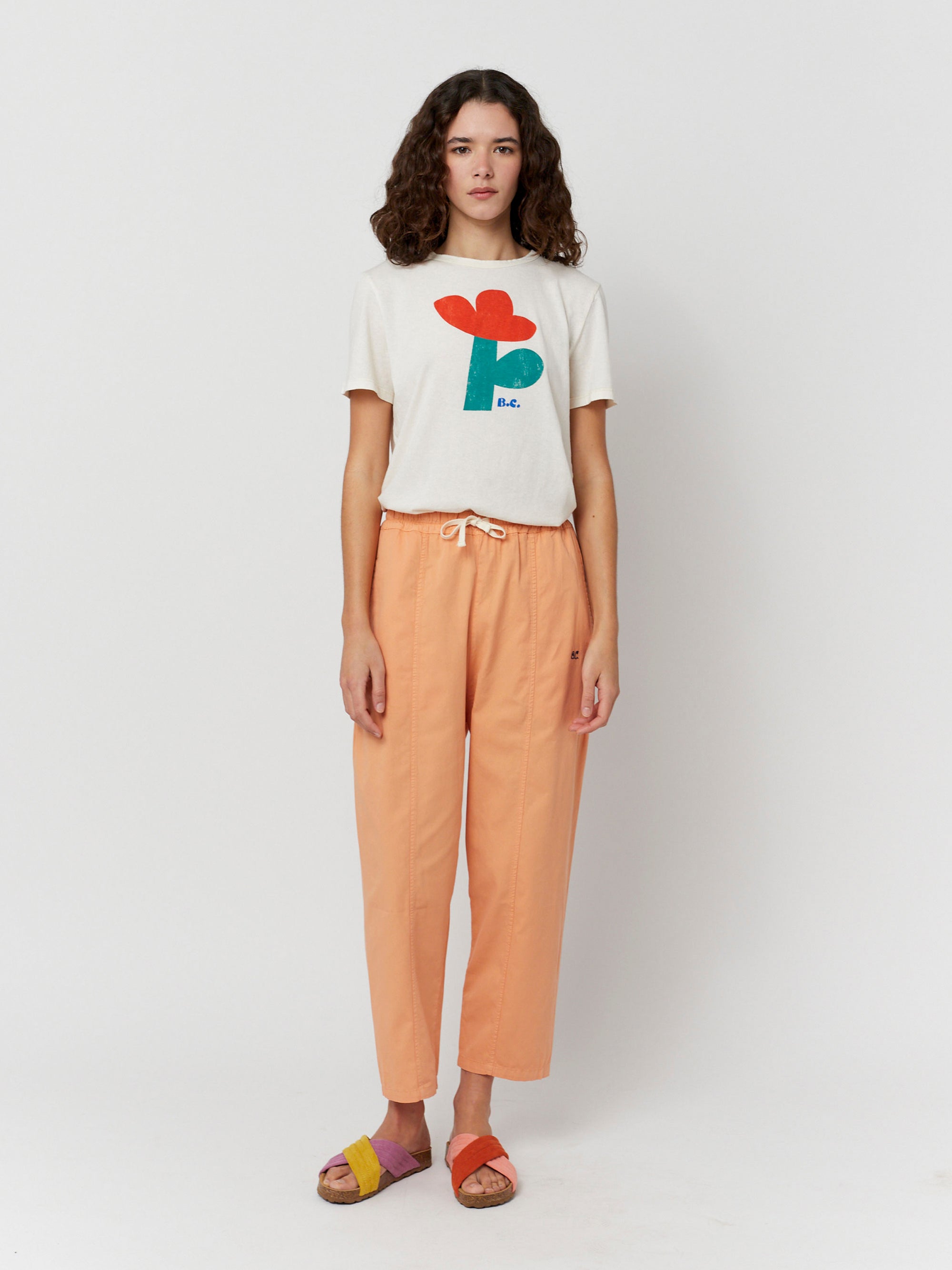 100% cotton peach straight trousers. Designed with regular crotch, adjustable waistband, side pocket, embroidery, ankle length and unisex. It has a cocoon fit. Made in Spain