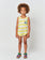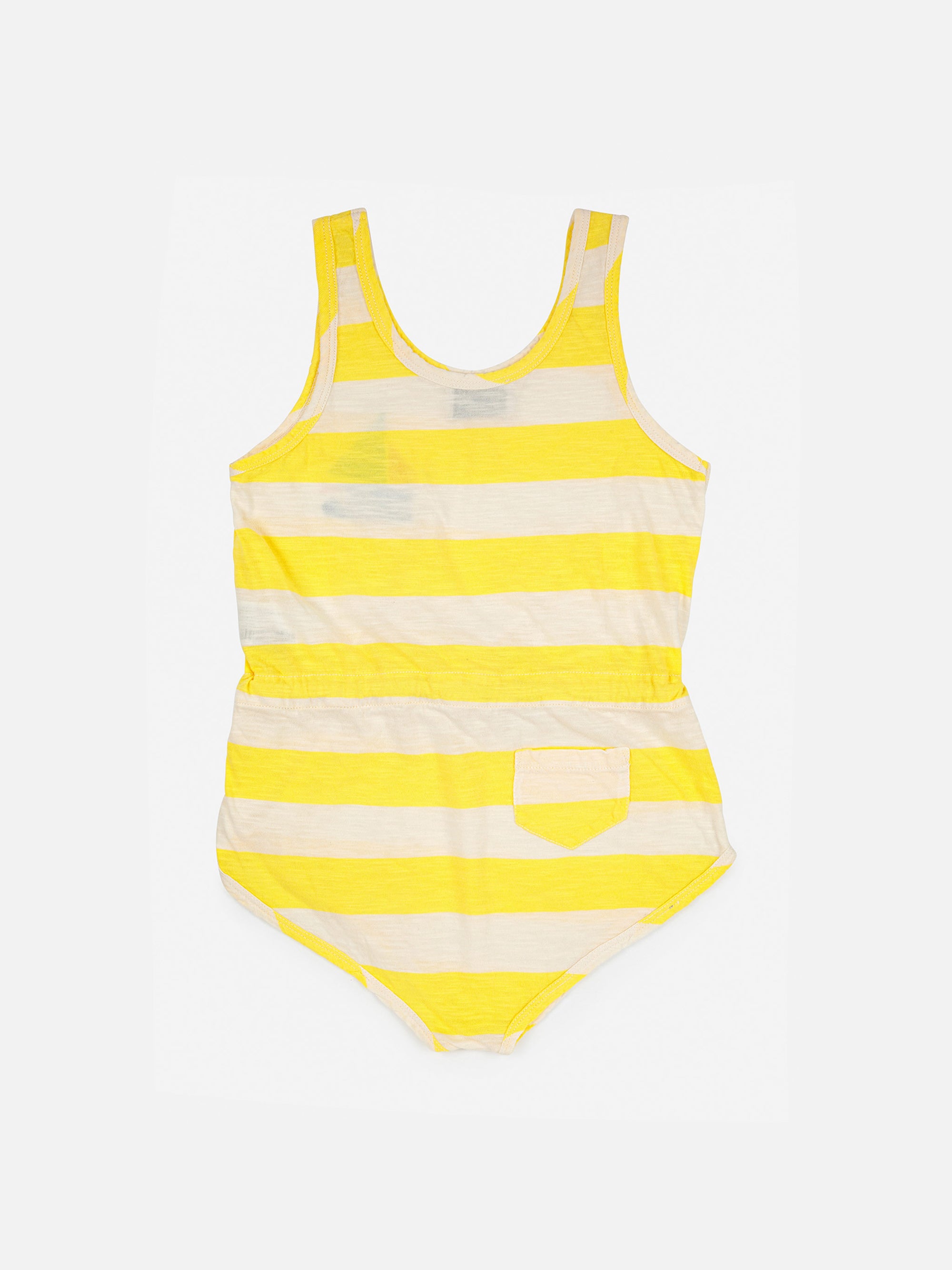 100% organic cotton yellow sleeveless playsuit. Designed with sleeveless, regular crotch, adjustable waistband, elasticated waistband, regular, short and round neck. It has a slim fit. Made in Portugal