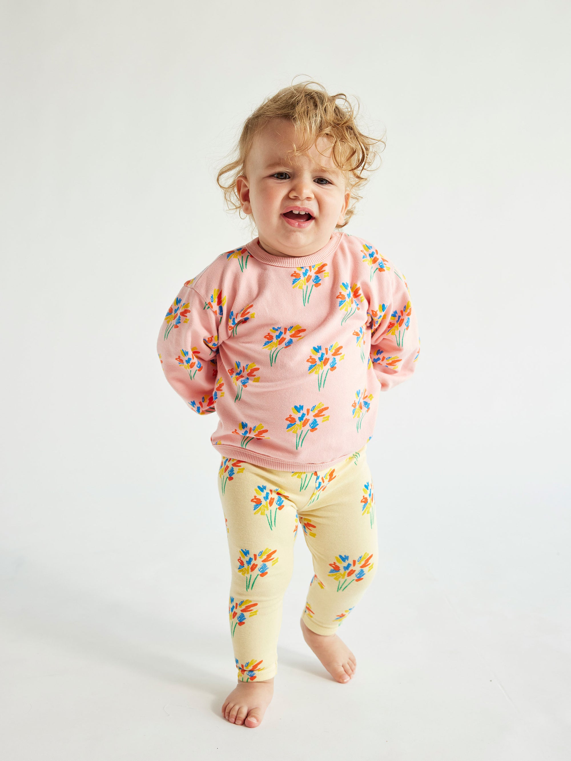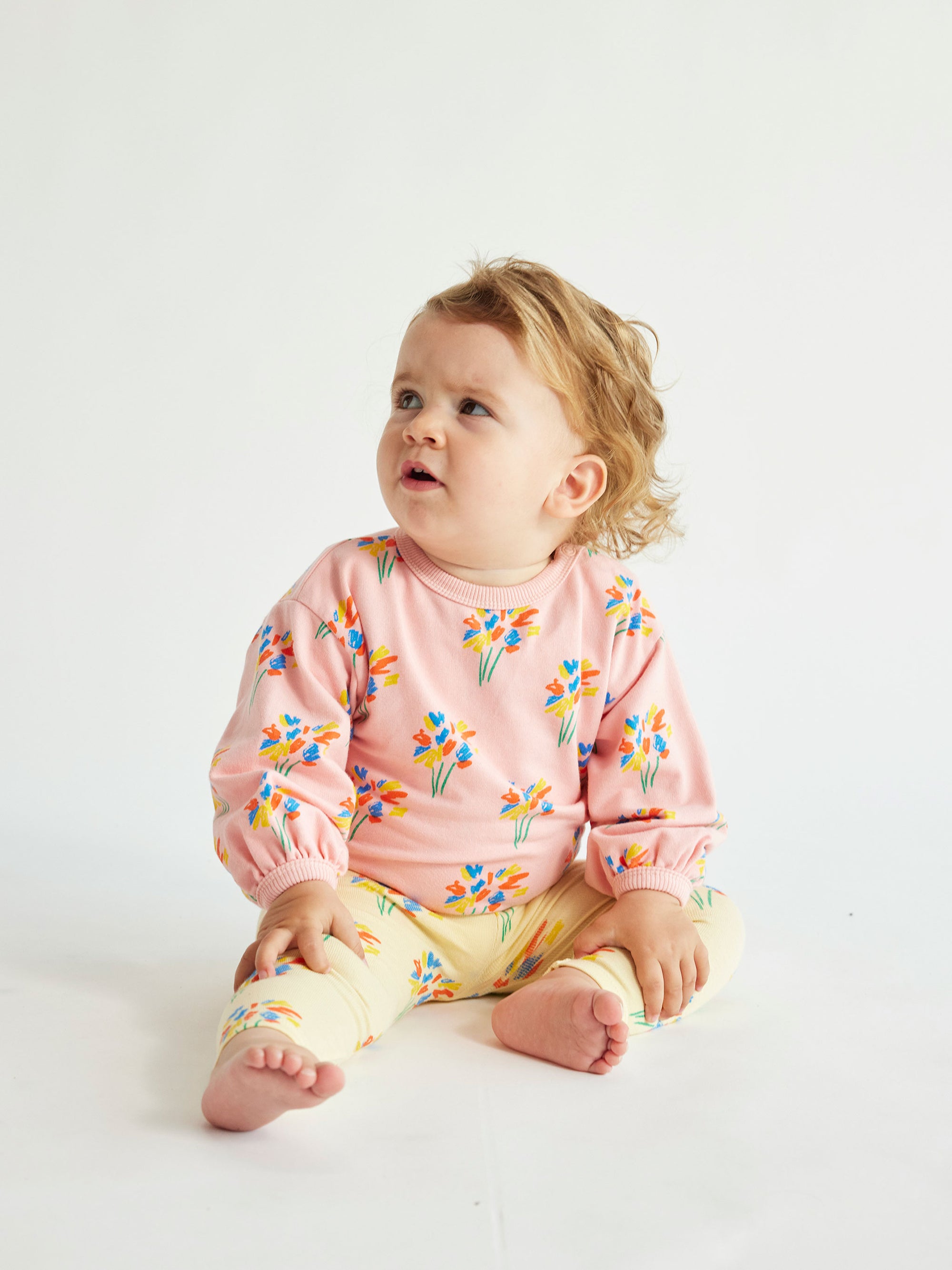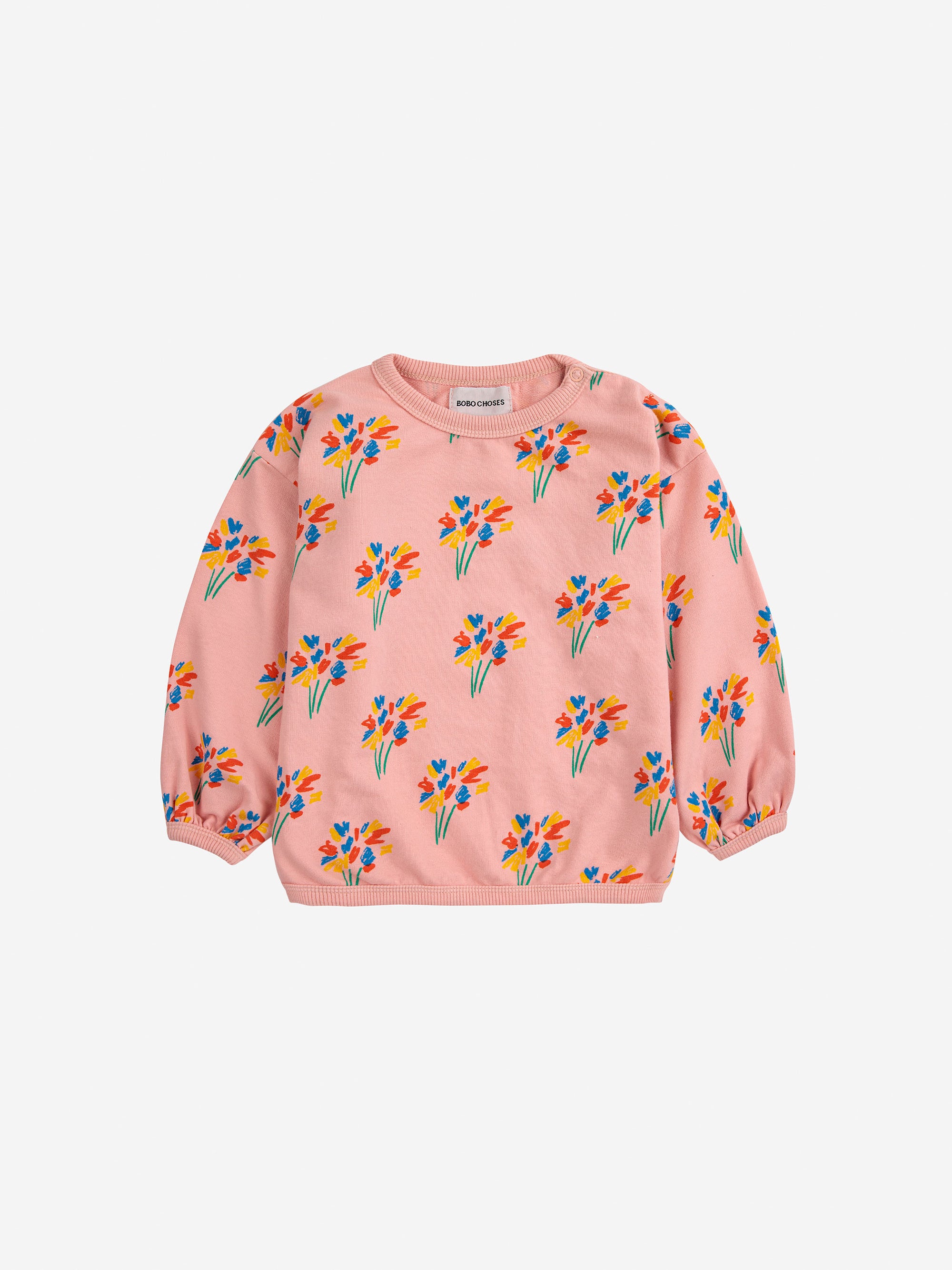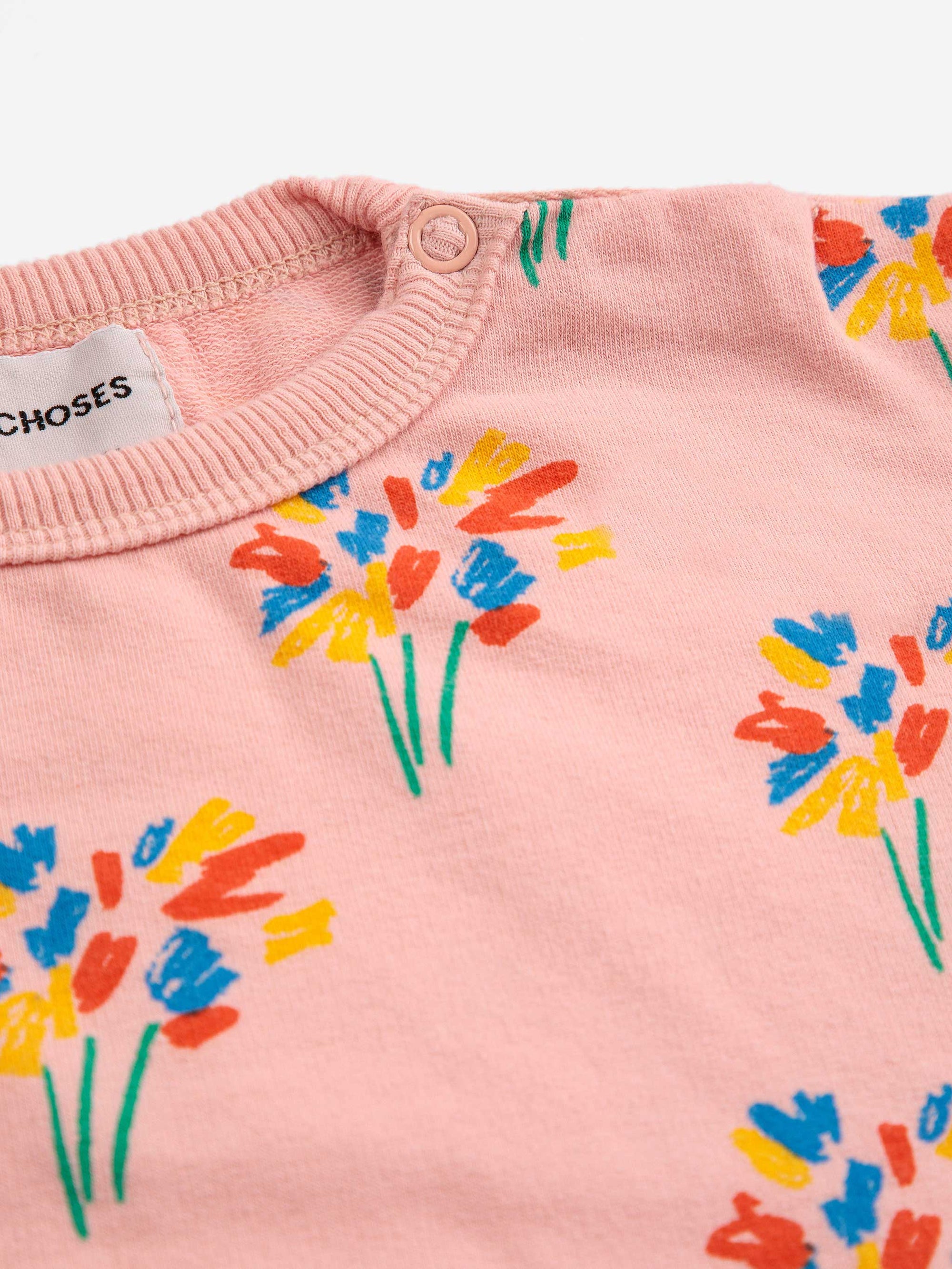 94% organic cotton, 6% elastane pink sweatshirt. Designed with long sleeves, dropped shoulder, shoulder snap fastening, loose fit, round neck and fleece. Made in Spain.