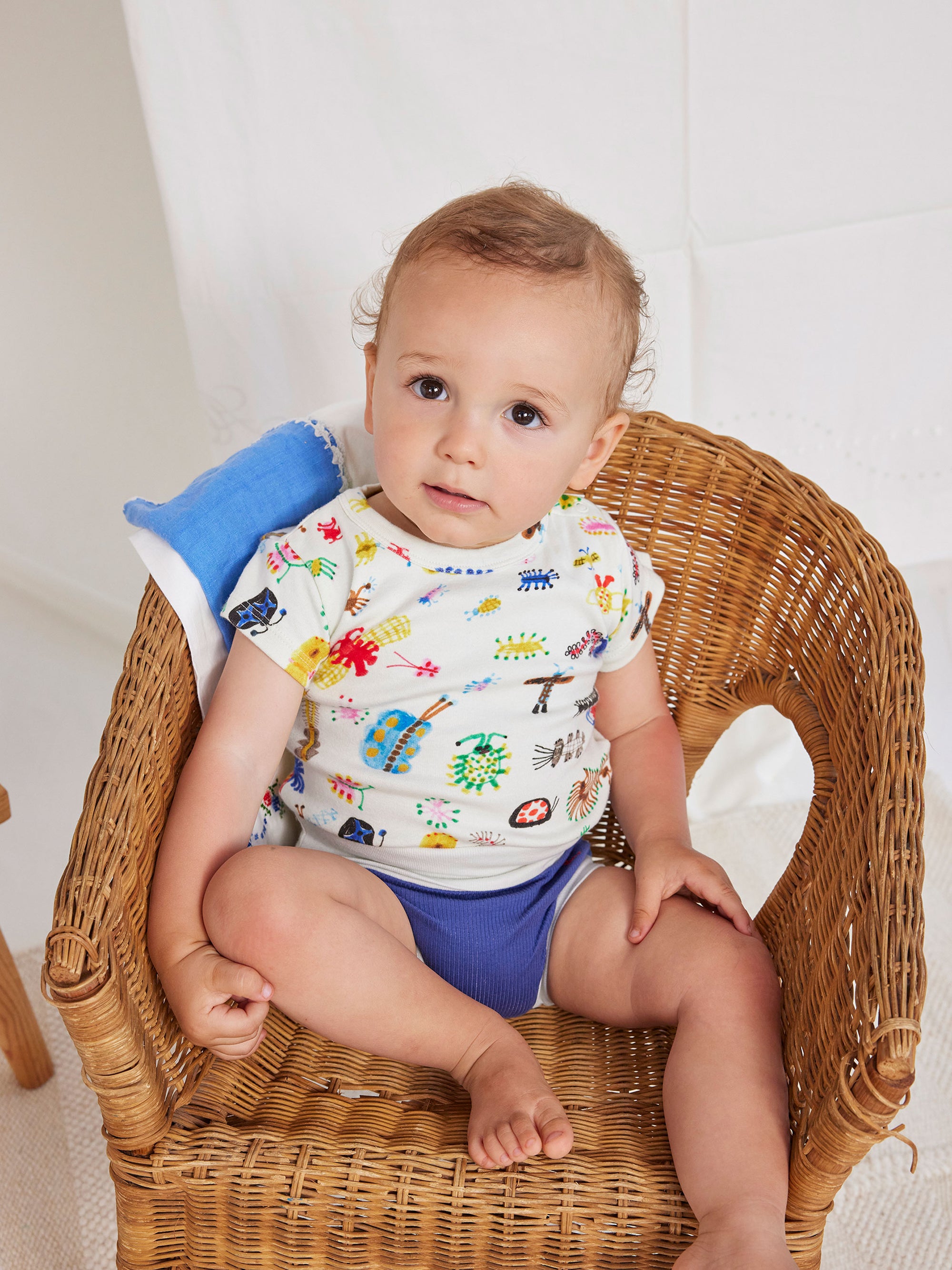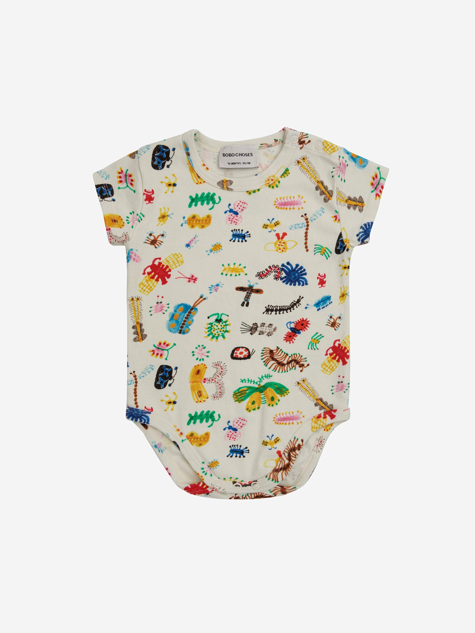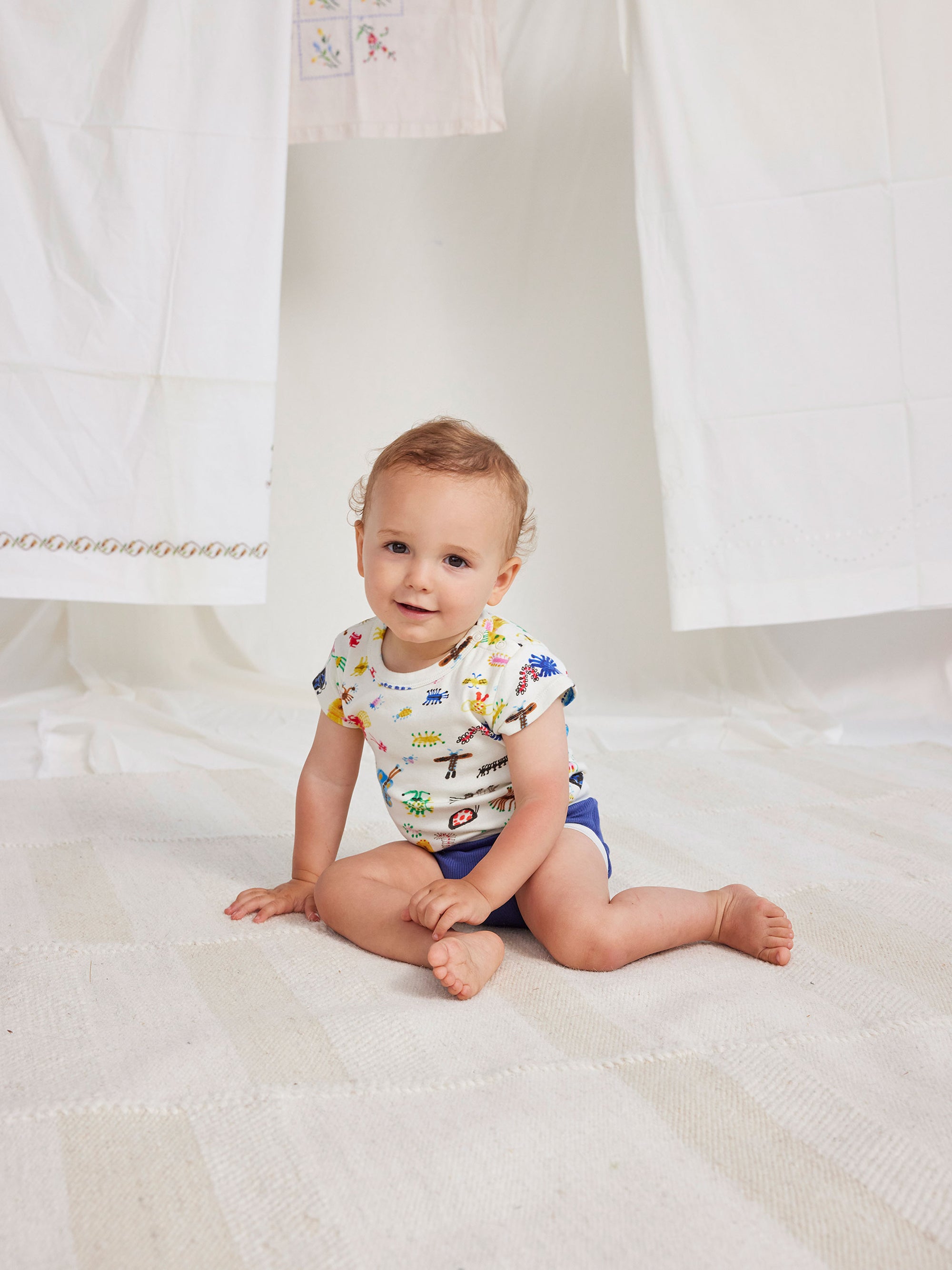 95% organic cotton, 5% elastane offwhite body. Designed with short sleeves, shoulder snap fastening, crotch snap fastening, slim fit and round neck. Made in Portugal.