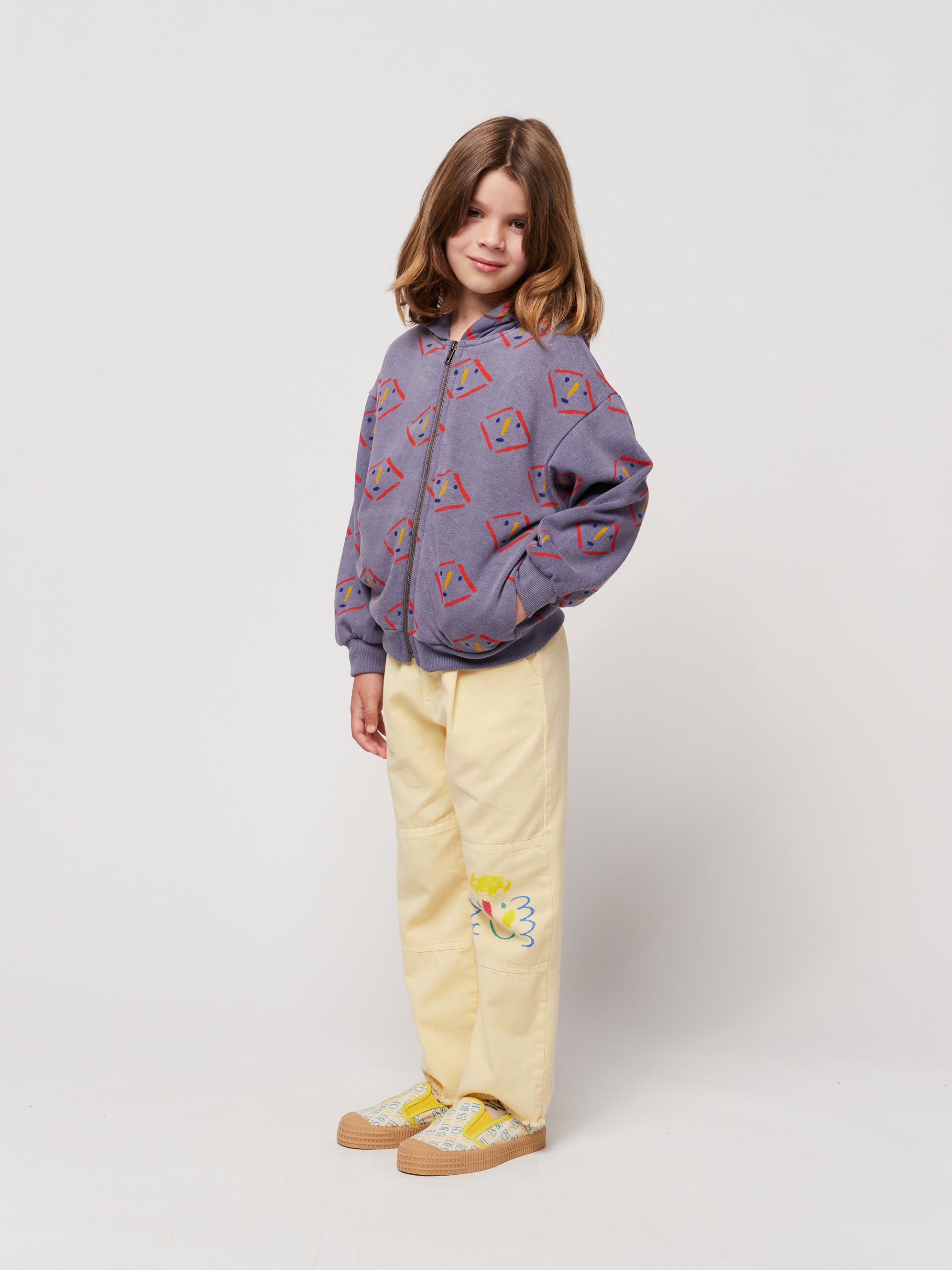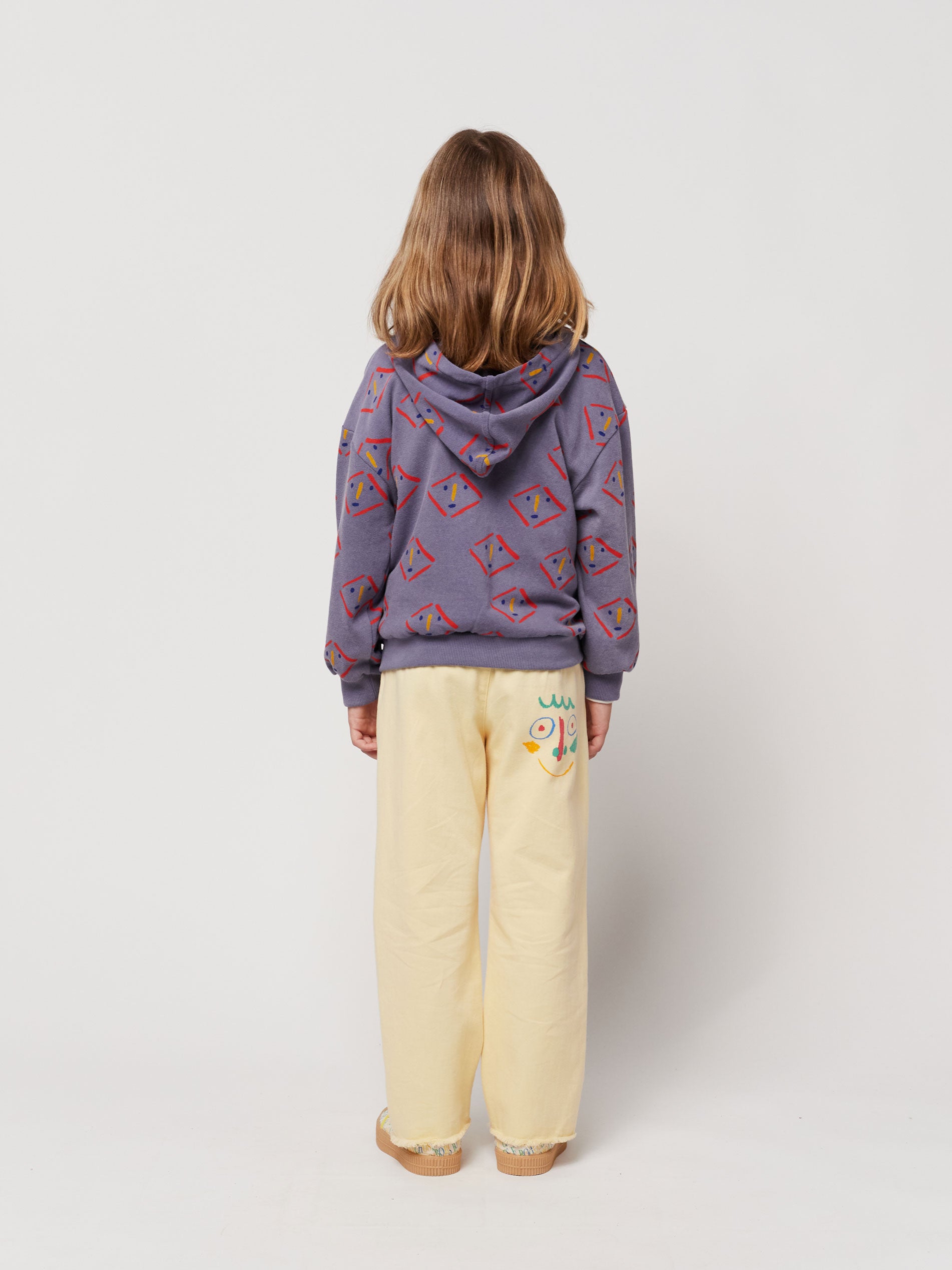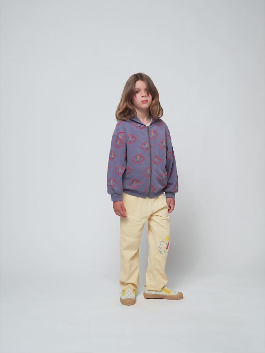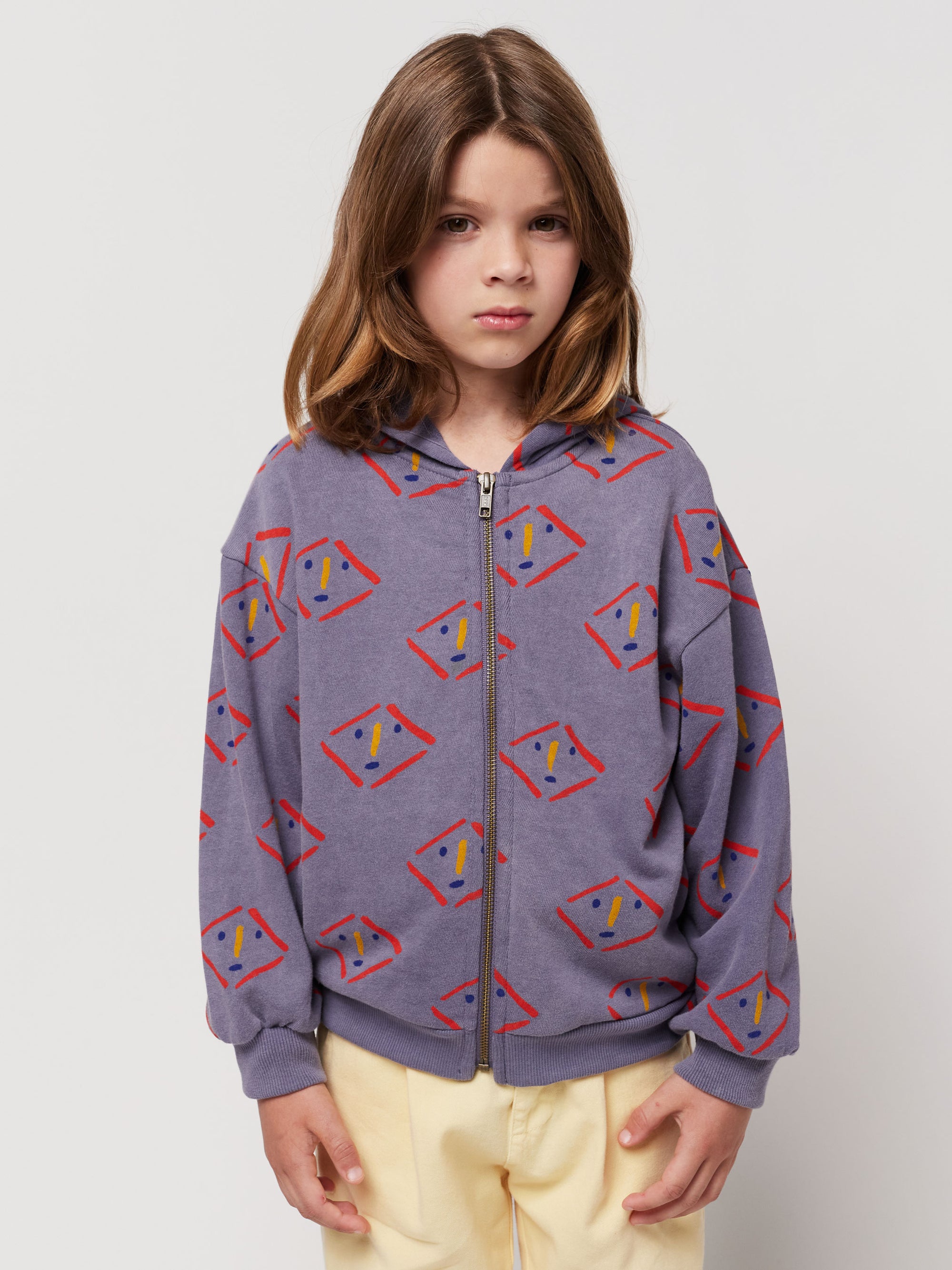 100% organic cotton prussian blue sweatshirt. Designed with hooded, long sleeves, zipped, ribbed cuffs, loose fit, ribbed bottom, seam pocket and fleece. Made in Spain.