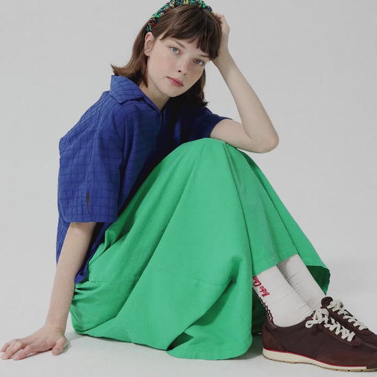 Green skirts. Designed for a relaxed fit, midi length, flared cut / evasé, non stretchy fabric and designed with pockets. Fits true to size, take your normal size. Made in Spain.