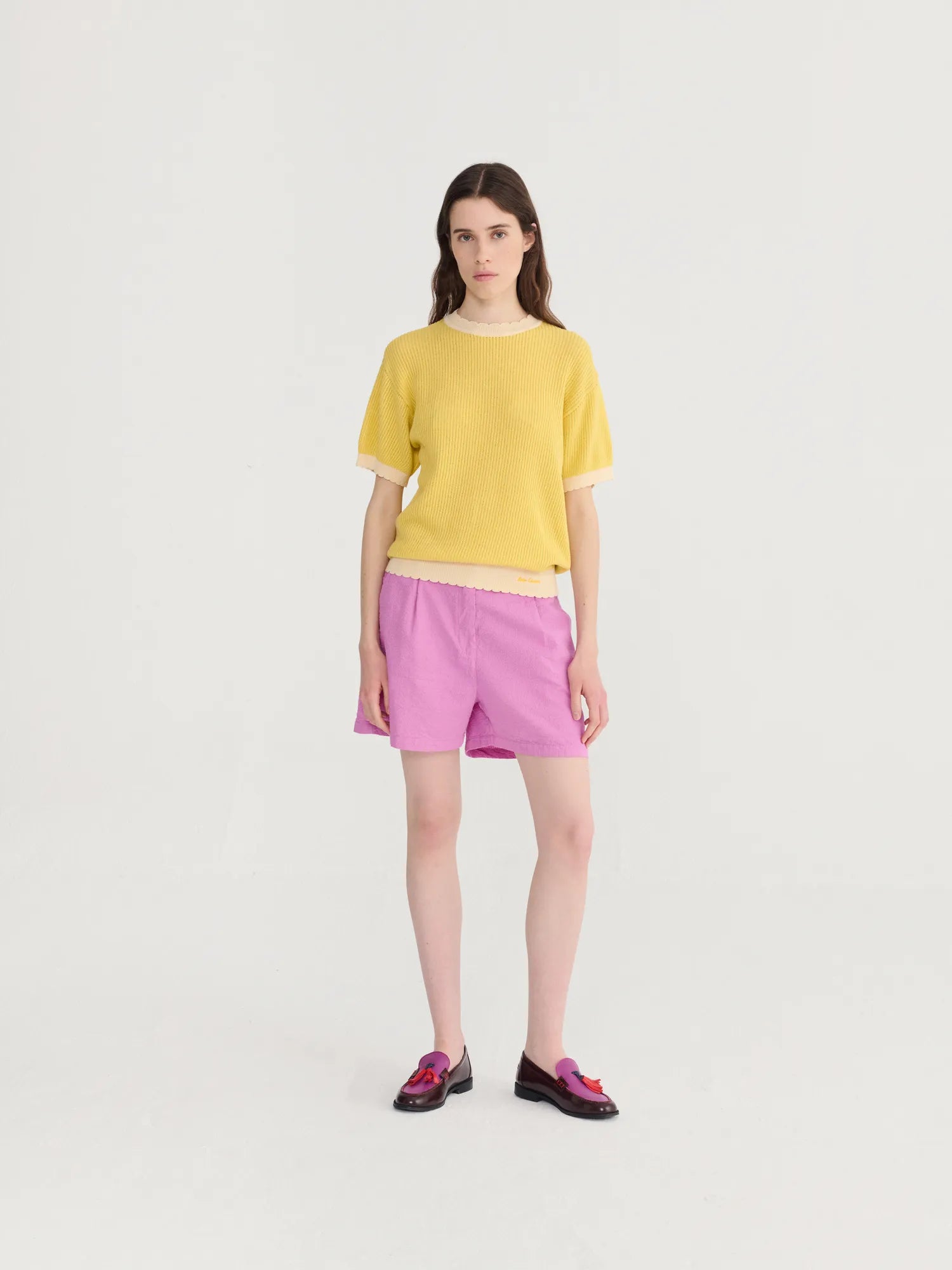 Yellow jumper. Designed with slightly loose fit and stretchy fabric. Fits true to size, take your normal size. Made in Spain.