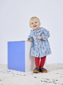Light blue dress. Designed with long sleeves, dropped shoulder, front button fastening, elasticated cuffs, embroidery, evasé fit, over knee length, round neck, denim and ruffled detailing. Made in Spain.