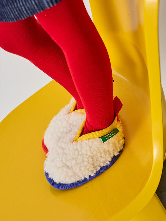 Tiny feet, bright steps. Made from natural merino wool and finished with colorful trims for a cheerful touch to winter outfits.