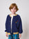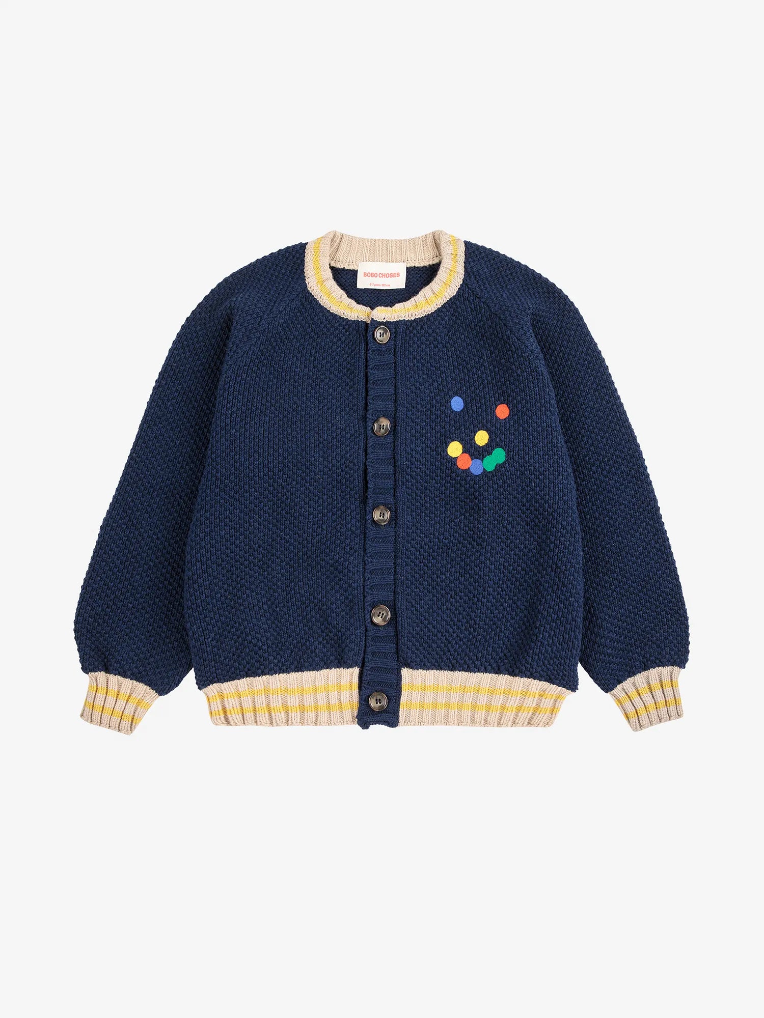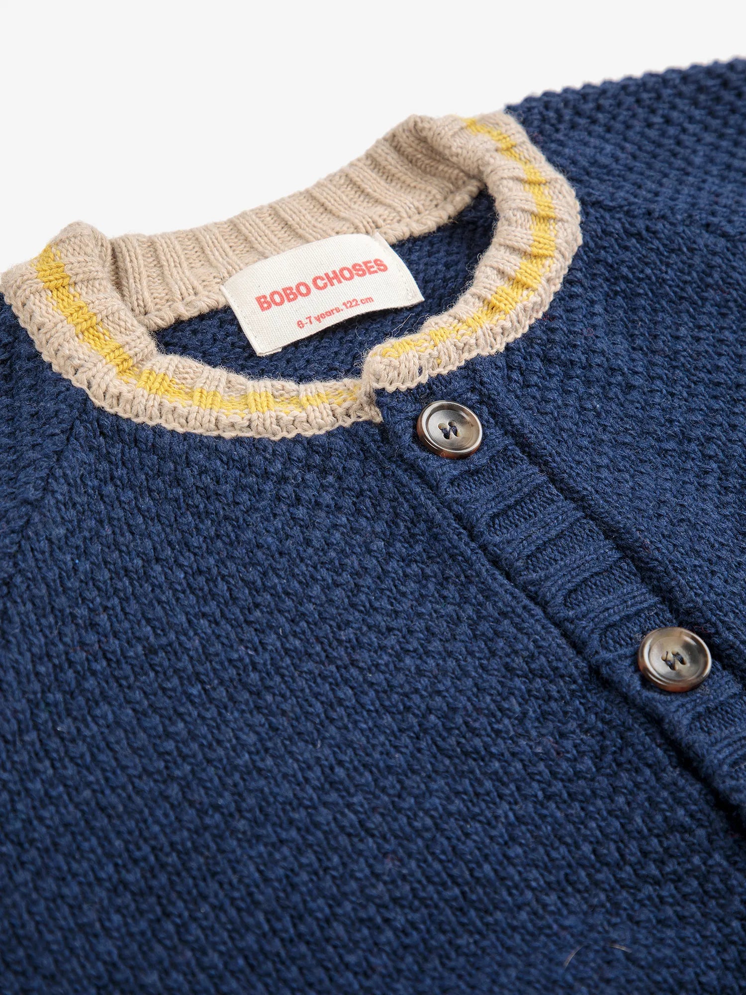 5% Recycled Cashmere, 35% Recycled Polyamide, 30% Recycled Viscose, 30% Recycled Wool Navy blue cardigan. Designed with raglan sleeves, front button fastening, ribbed cuffs, embroidery, texture knit, loose fit, ribbed bottom and round neck. Made in Spain.