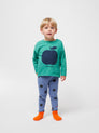 The long-sleeved green 'Poma' T-shirt is crafted from recycled cotton and features an iconic midnight blue apple design from Bobo Choses' early years on the front. It has a loose fit with dropped shoulders for unrestricted movement and a cosy feel. It includes a shoulder snap fastening for easy dressing.