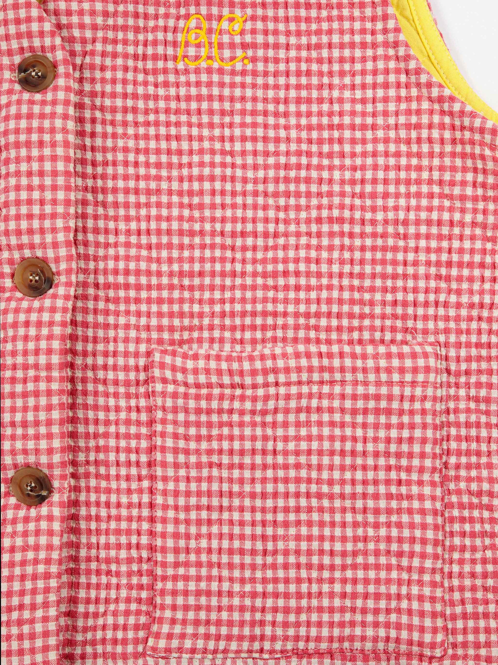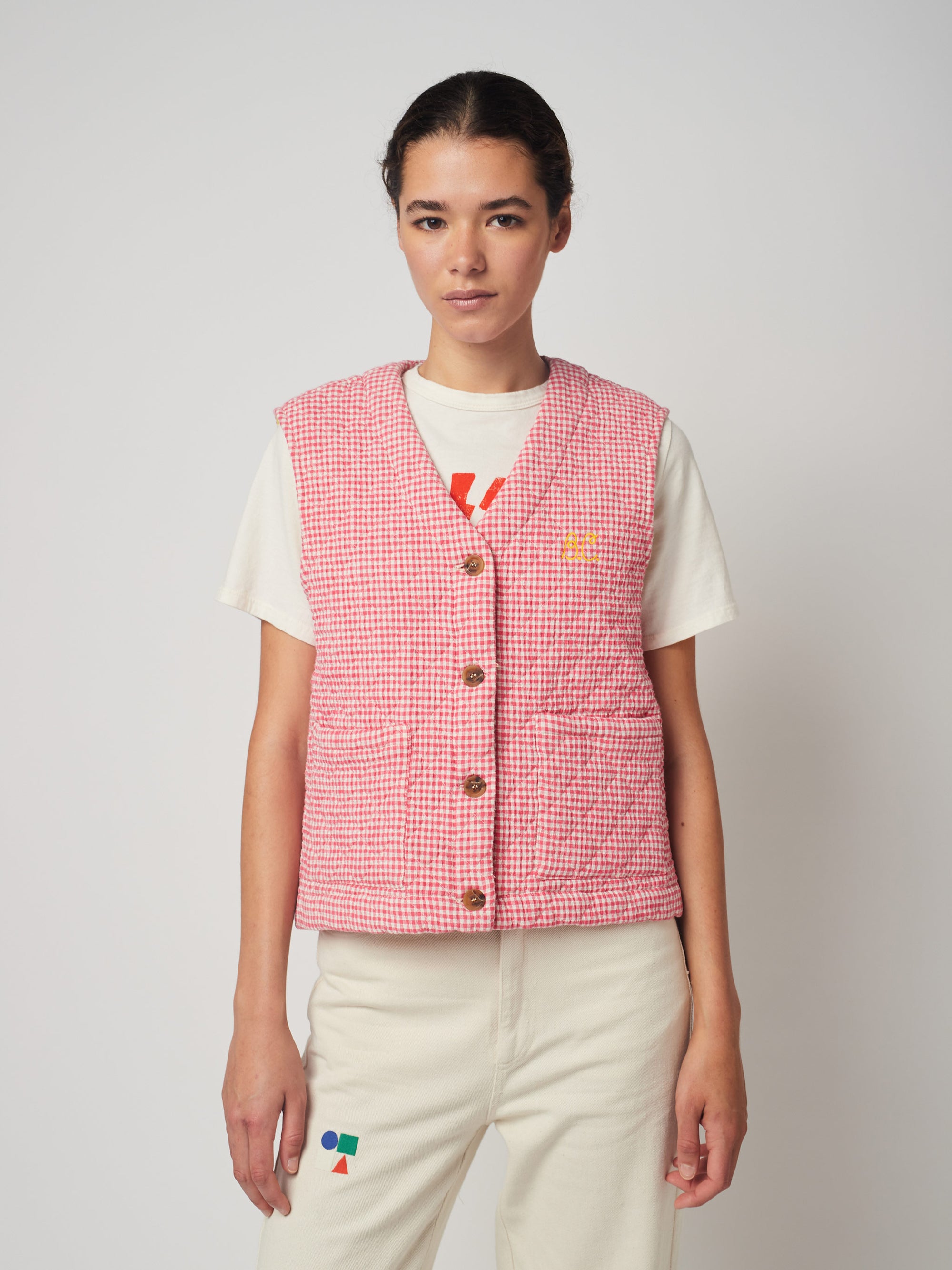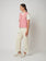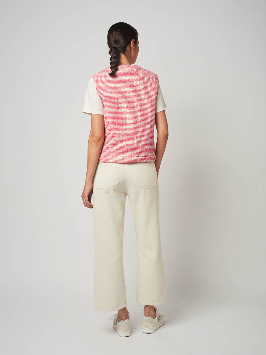 84% cotton 13% linen 2% polyamide 1% elastane pink vest. Designed with v-neck, front button fastening, embroidery, cotton lining and patch pocket. It has a straight fit. Made in India