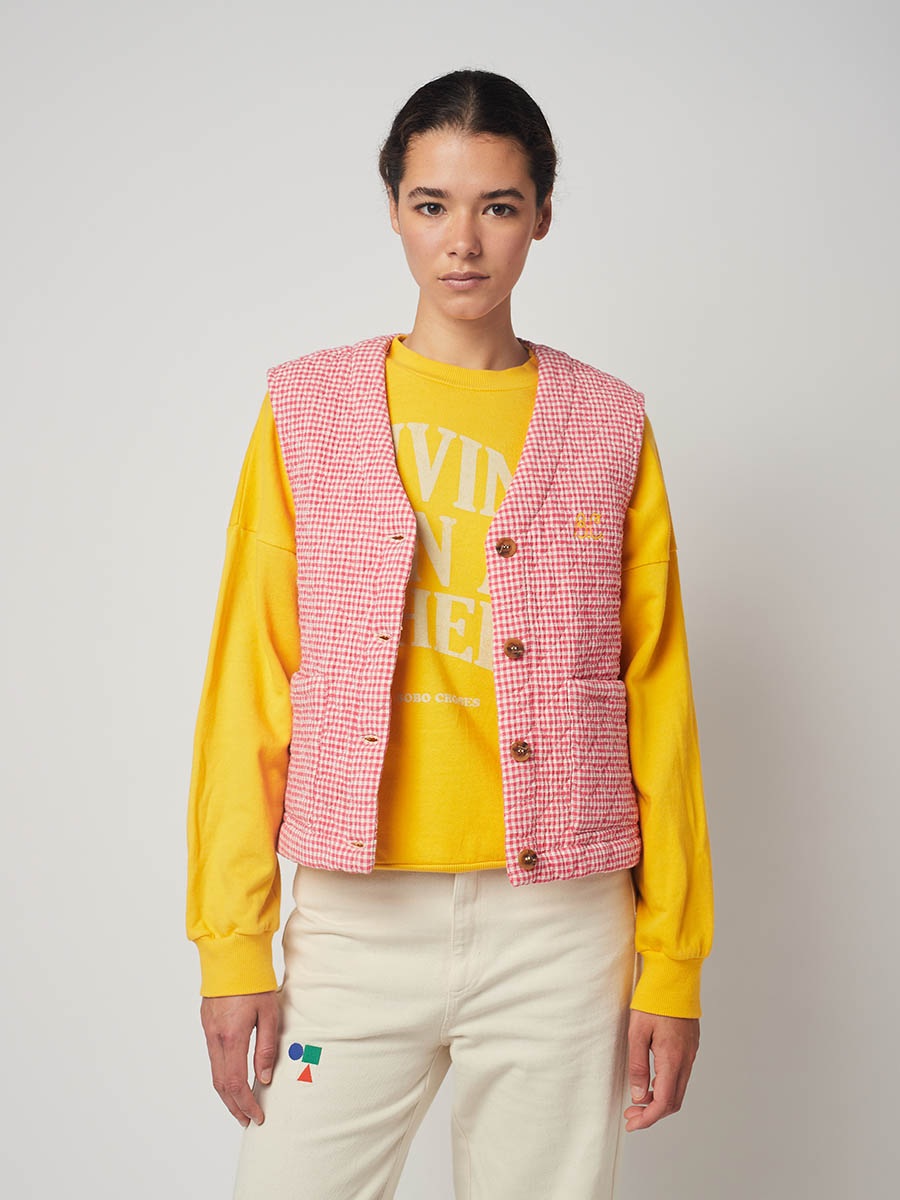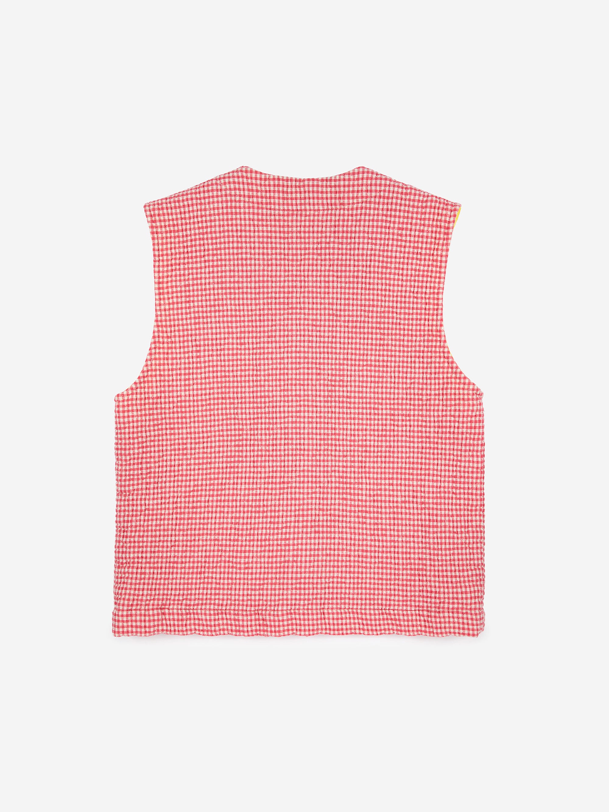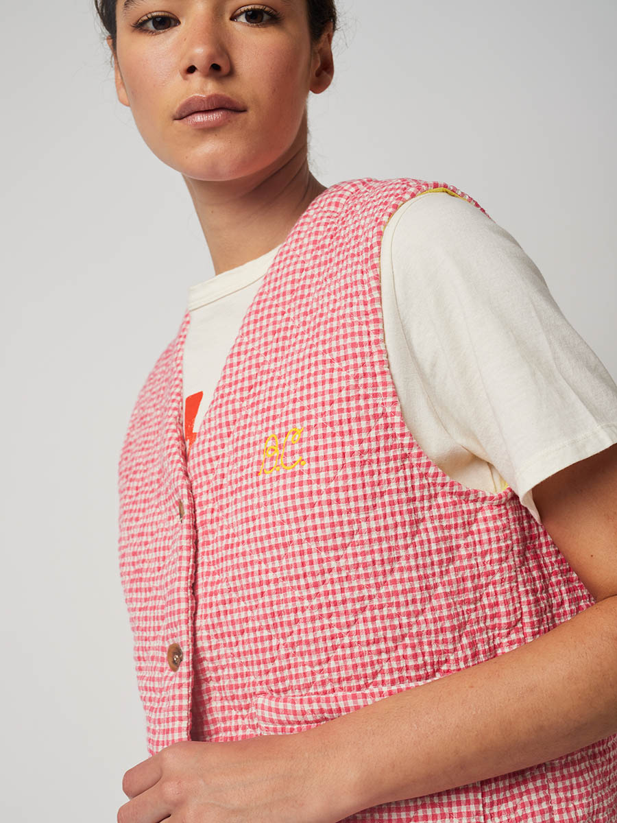 84% cotton 13% linen 2% polyamide 1% elastane pink vest. Designed with v-neck, front button fastening, embroidery, cotton lining and patch pocket. It has a straight fit. Made in India